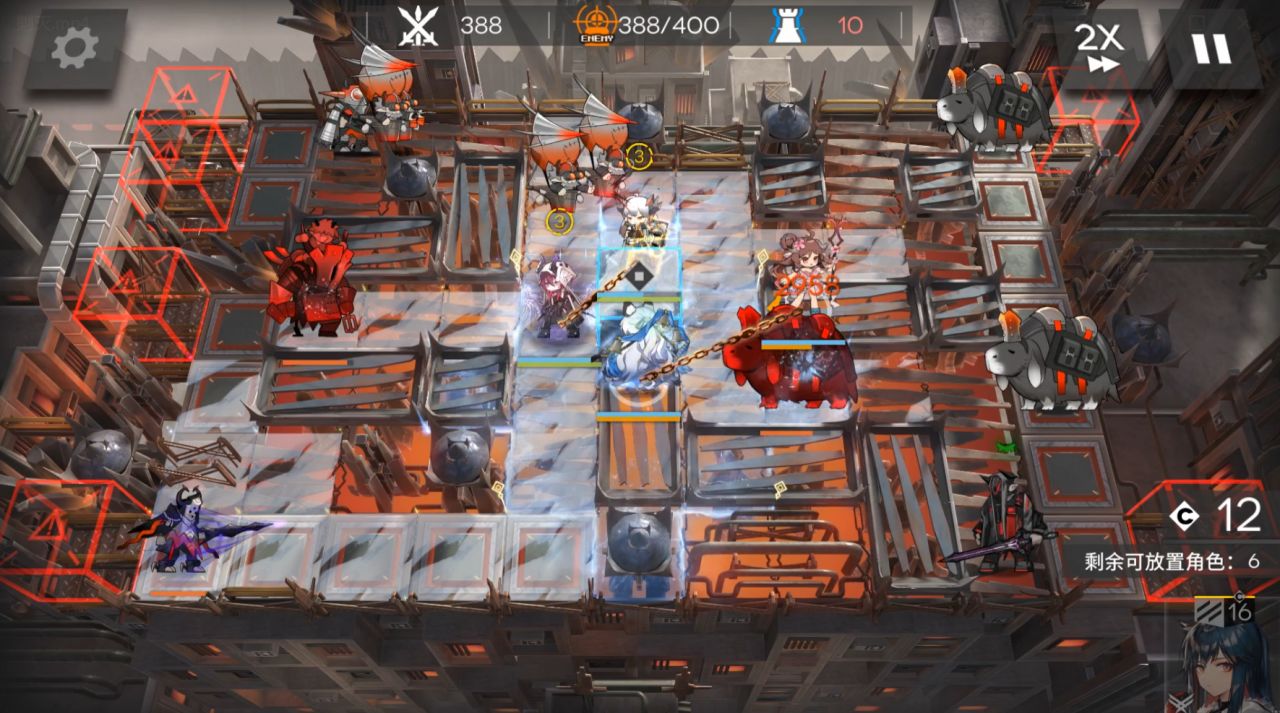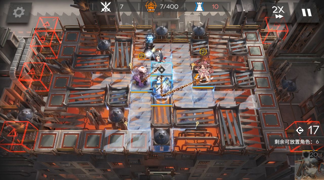 开局先锋朝左放塞雷娅位置朝左,依次部署初雪朝上,小羊朝左,阿斯卡伦朝左挂机,撤退先锋放塞雷亚。小羊和阿斯卡伦可换其他输出,这里最后蓝门冻住被打了一下,小羊那边输出差了一点。阿斯卡伦减速很稳,不过实际上敌人卡其脱离太冲过来的时候会被初雪地面的雪冻住,地刺有50闪避,需要抗左边红门无法阻挡的怪的攻击,塞雷亚最后放,抗伤左上角的飞行兵。
