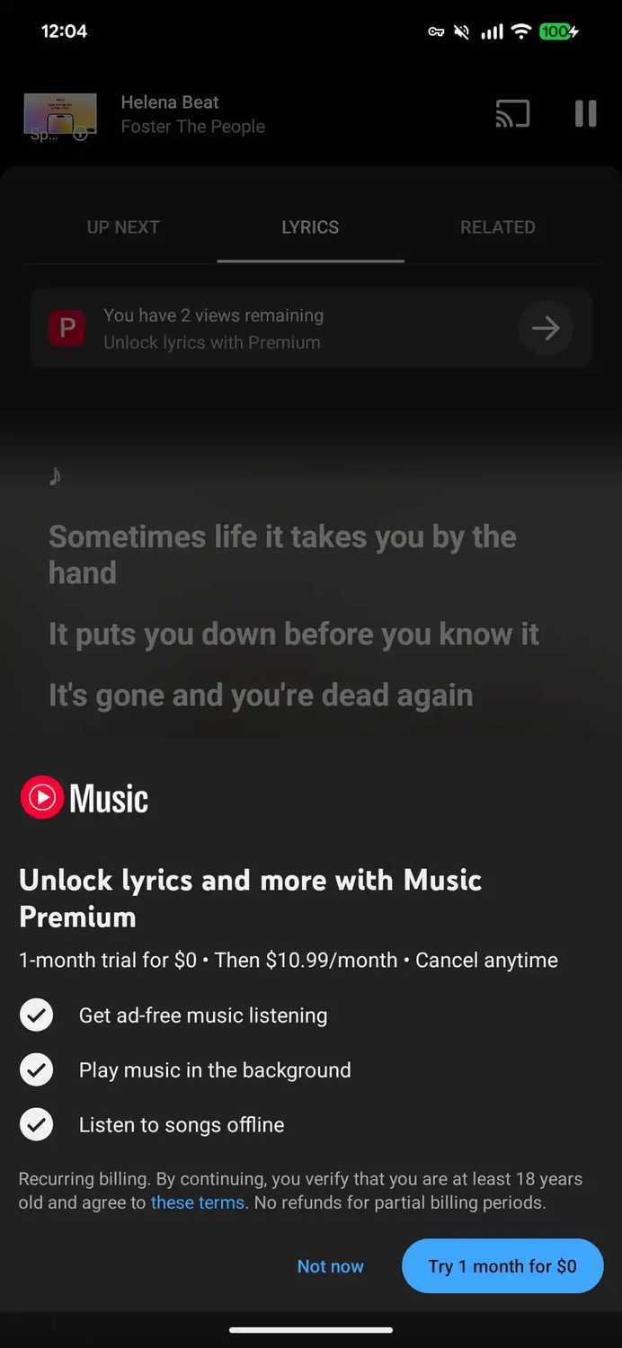 近日,谷歌旗下音乐流媒体平台 YouTube Music 疑似正式开始在全球范围内扩大歌词功能限制。据大量用户反馈及媒体报道,非 Premium 会员(即非VIP用户)用户在查看完整歌词时将面临次数限制,这一曾属于基础免费服务的项目正逐渐被归入会员权益。