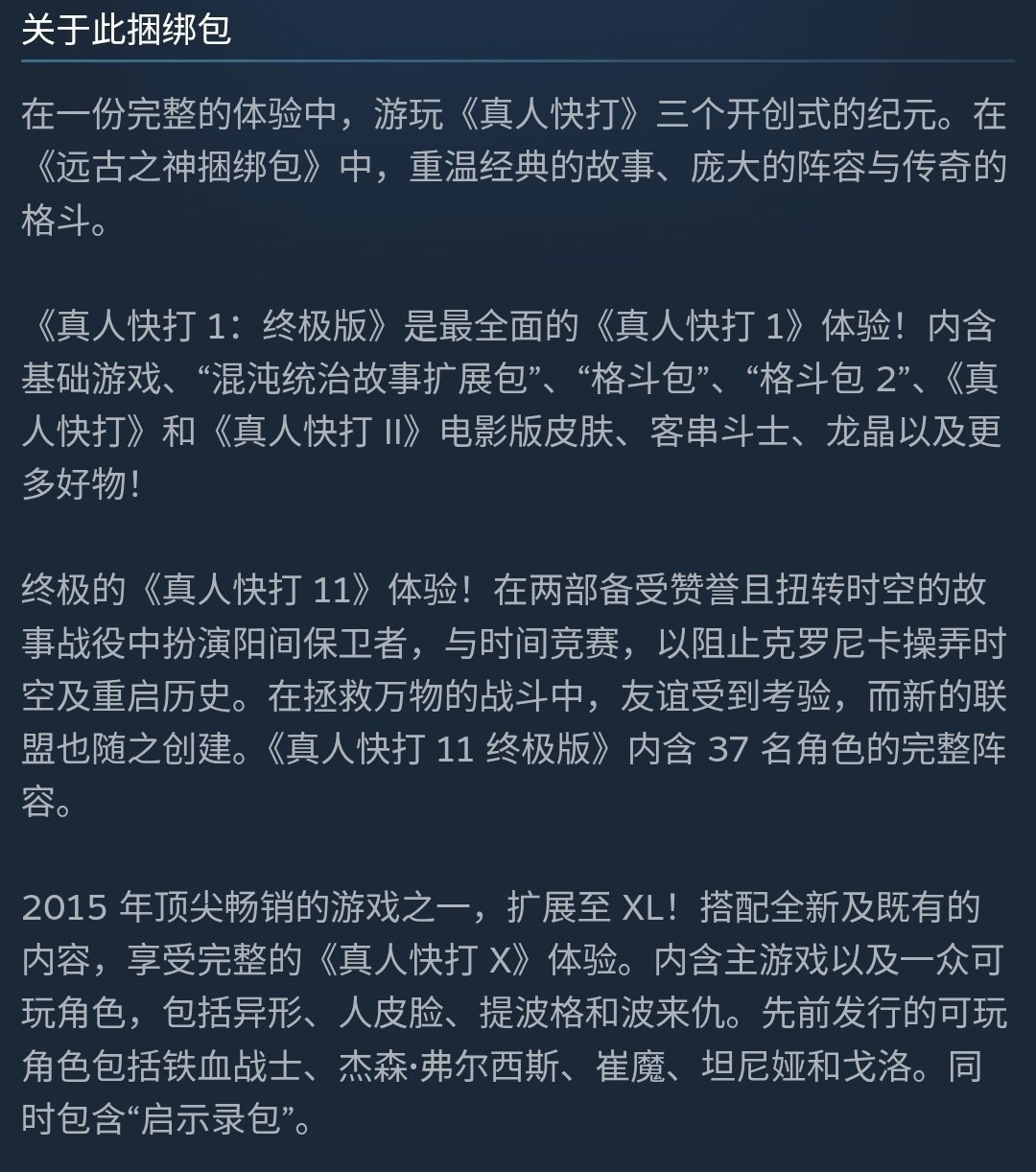 在商店頁面中,關於這個捆綁包的描述是擁有《真人快打1》終極版以及兩部前作的終極版,分別是《真人快打11》和《真人快打X》