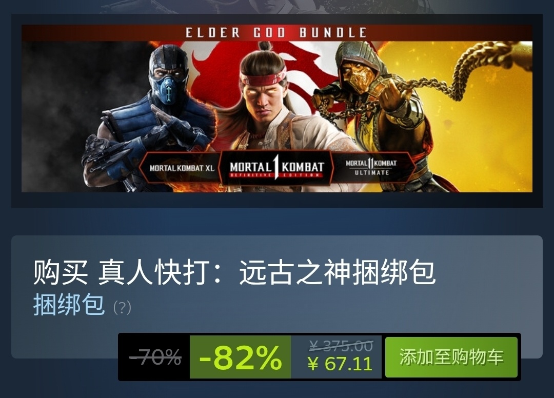 可以看到,遊戲的本體價格竟然和這個遠古之神的捆綁包價格差不多,可以說是妥妥的臨時工。選擇上面的鏈接或者直接搜索《真人快打1》進入遊戲頁面之後就可以看到這個可補齊的捆綁包。