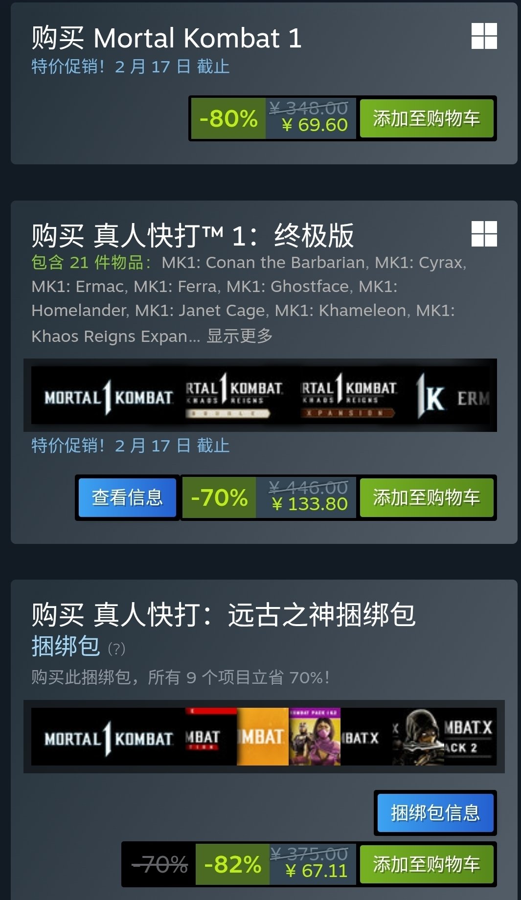 在今日凌晨開啓的日常特惠中,《真人快打1》捆綁包再次臨時工,和上次一樣。