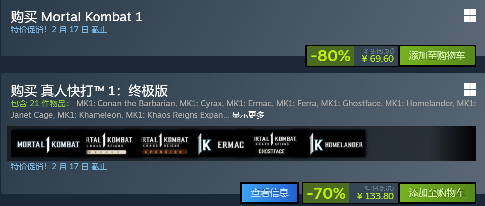 《真人快打 1:终极版》是最全面的《真人快打 1》体验!内含基础游戏、“混沌统治故事扩展包”、“格斗包”、“格斗包 2”、《真人快打》和《真人快打 II》电影版皮肤、客串斗士、龙晶以及更多好物!