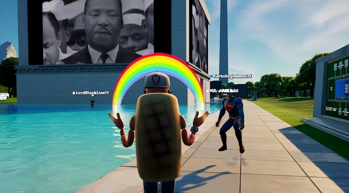 結果就是,一大羣網絡巨魔衝進了聯動地圖開始瘋狂搞事,在馬丁·路德·金影像面前瘋狂跳舞嘲諷,往影像和其他玩家身上狂丟番茄,還有人發起了“鞭子”的Emoji,暗示“狂野西部上線就送一百抽”……