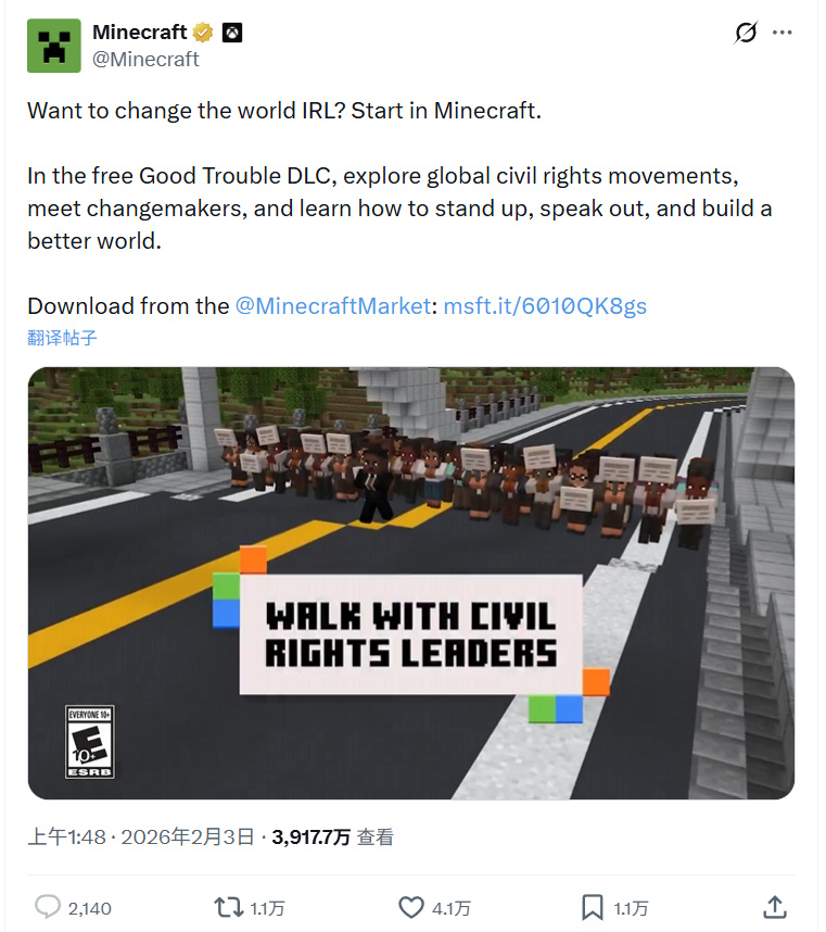 每年的二月,是美國的“黑人歷史月”。歷年這個時候,《我的世界》官推都會發布一些黑人民權運動相關的推文,雖然每次都會有網絡巨魔前來添亂,卻從未有一次被上升到如此高度——事實上,早在2024年2月,他們就發佈過《Good Trouble》相關的宣傳,而在當時,這些內容幾乎沒有引發任何關注,評論區整體上也較爲和諧。
