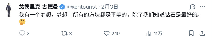 有人玩起了馬丁·路德·金名言“我有一個夢想”的梗——“我有一個夢想,夢想中所有的方塊都是平等的,但我們都知道鑽石纔是最好的。”
