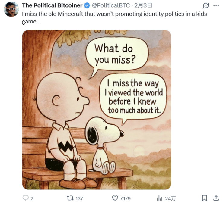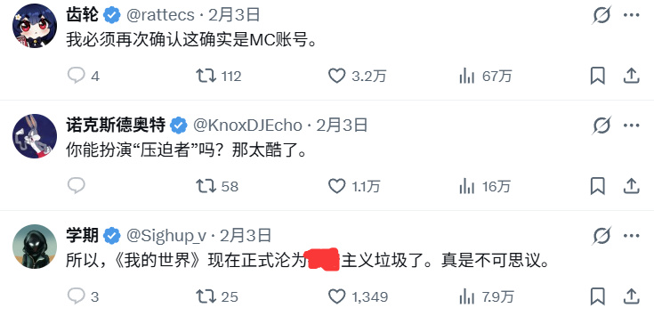 在社會環境不那麼緊張時,《我的世界》姑且還能用這種不斷疊Buff的方式滿足各方需求。然而,當社會本身被撕裂,“反政確”思潮變成新的政治正確時,兼顧一部分人的看法,就會觸及另一部分人的雷區。而在高度敏感的輿論環境下,任何的出格行爲都可能被無限上升,引發難以預測的災難性後果。