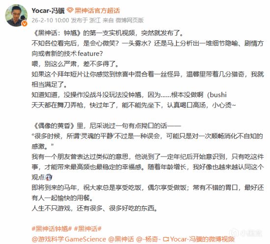 2月10日,游戏科学正式放出《黑神话:钟馗》首支短片,同步上线全平台,短片由虚幻引擎5驱动,次世代画面质感拉满,引发玩家热议。同日,游戏科学创始人、制作人冯骥发微博回应,语气松弛调侃“别太严肃,差不多得了”。