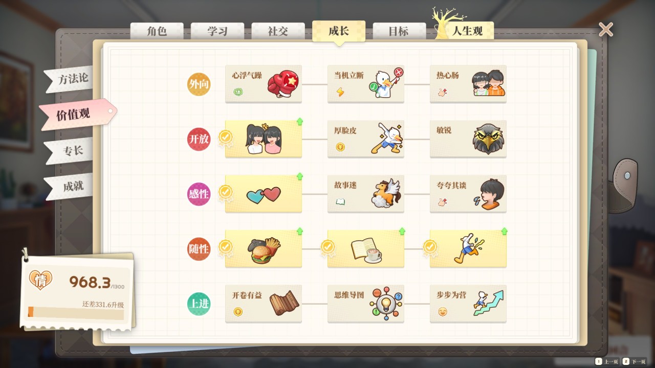 在资源投入和属性增长中间,本作加入了丰富的养成机制。天道酬勤的进步、一起看流星雨的陪伴、攻占广播室的洒脱,这些校园经历塑造了角色的人生观。智、情、体又与方法论、价值观、专长联系起来,像是天赋树提供额外加成,降低各项资源属性获取难度。