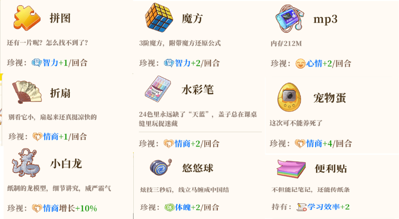 学业成长方面,是资源管理+模拟经营;而在交友恋爱方面,则是文字小说+GAL。从小学、初中到高中,游戏里发小铁哥们和青梅竹马会一路陪伴主角成长。从朋友、好友、密友、挚友、至交到恋人,在朝夕相处中友谊得到升温,甚至升华(恋爱)。