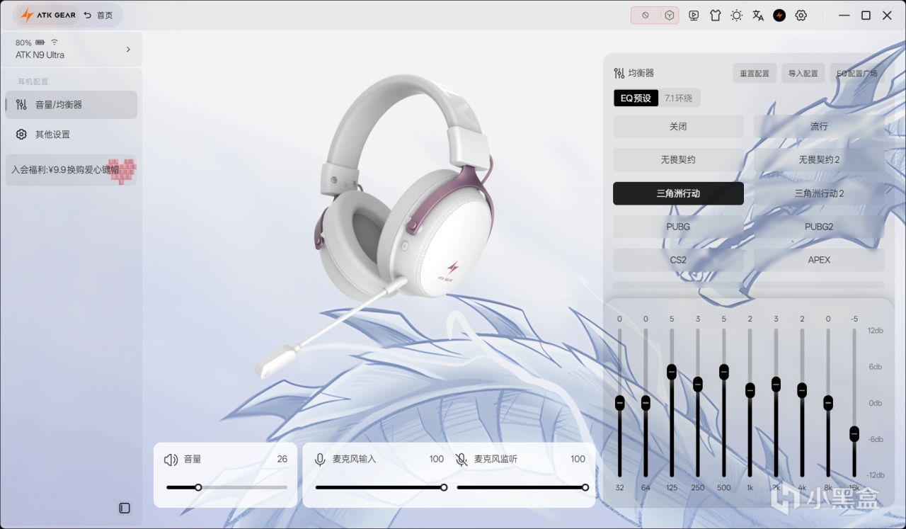 接下来咱们就以ATK的N9 ULTRA 头戴耳机为例,给大家示范一下耳机调整EQ后对游戏整体体验的提升效果。