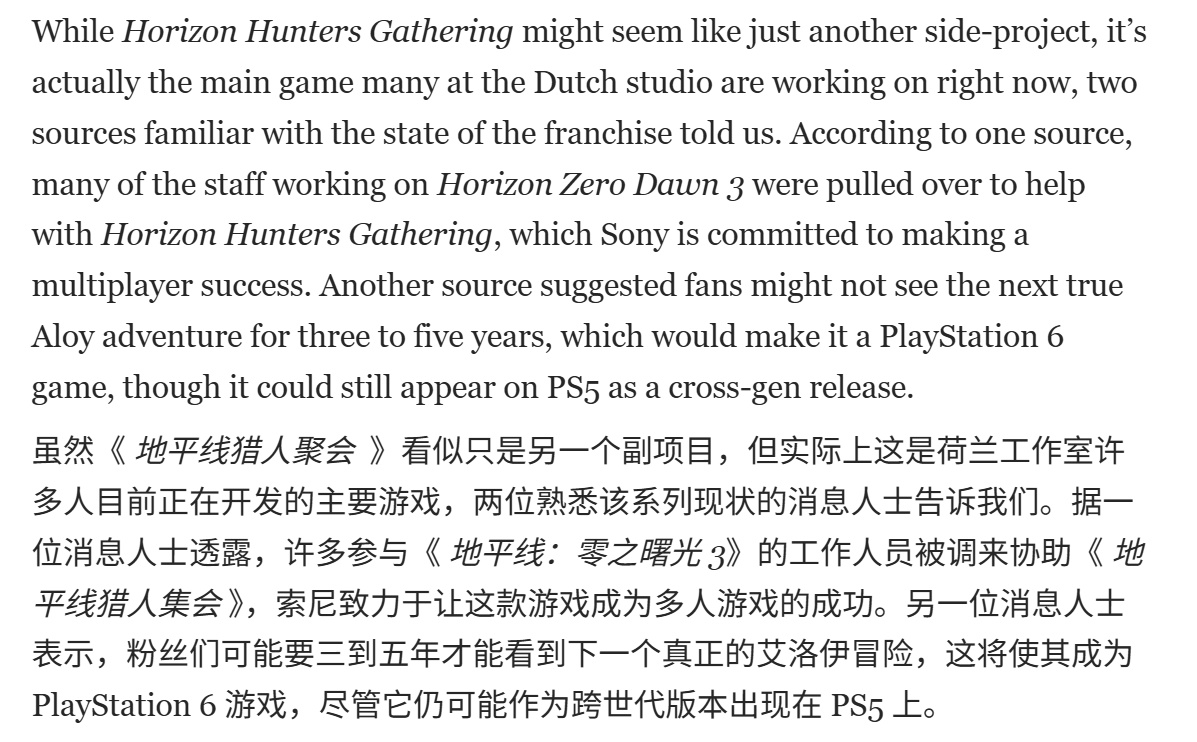 《地平線3》很可能爲PS6平臺量身打造,但這也並不完全排除登陸PS5的可能性。《地平線:西之絕境》在2022年發售時就採用了跨世代策略,有理由相信索尼會在其他作品(包括頑皮狗的《星際:異端先知》)上延續此策略。