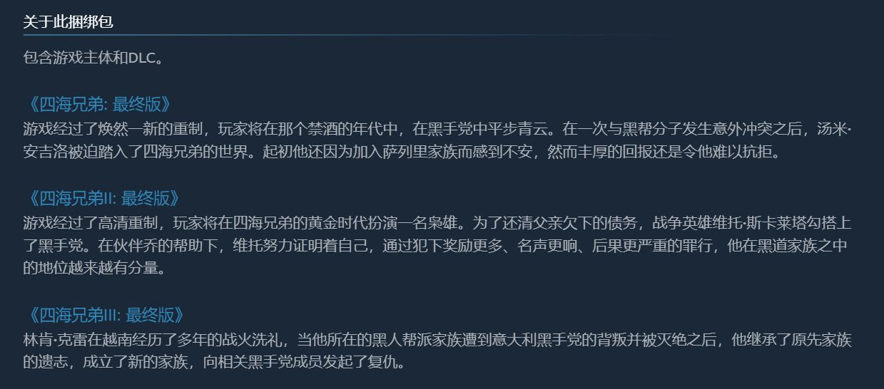 《四海兄弟》三部曲其實是四個遊戲,其中1是完全重製的版本,2是高清重置了一下,並且附帶一個2的原版,3是帶全DLC的終極版,不需要再去購買額外的DLC就可以體驗到全部遊戲內容。