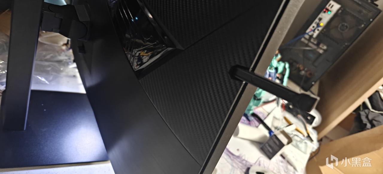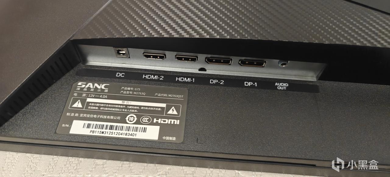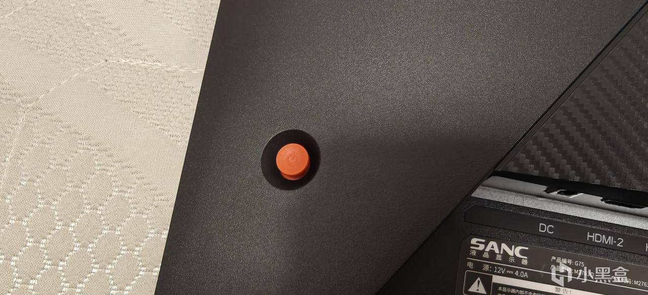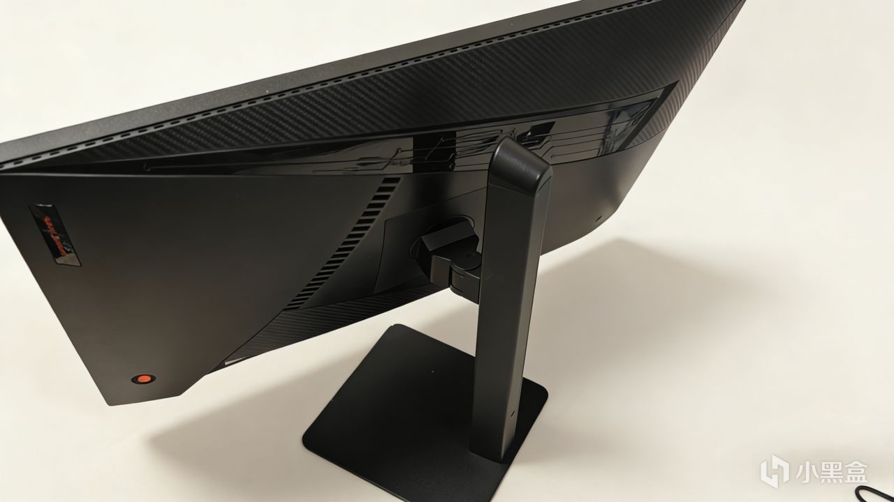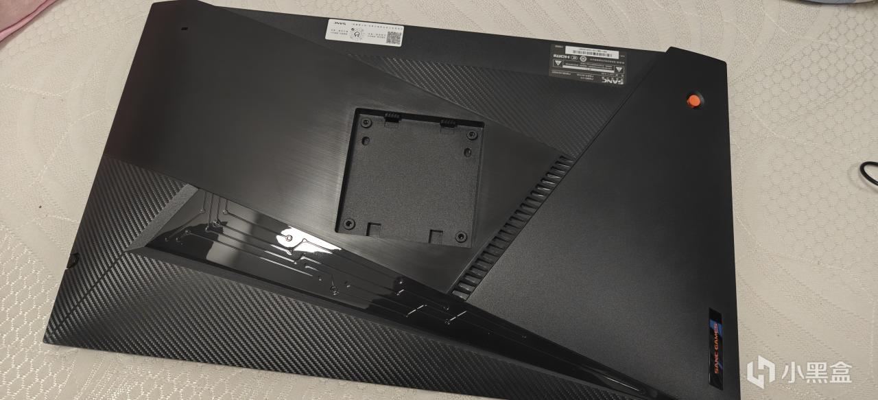 显示器外观方面还是一如既往的简洁,经典的三面超窄。左下角有贴纸显示显示器的特点,黑色质感很不错。背面大尺度的线条分割,让显示器的颜值提升了不少。一边是机械电路板纹路,一边是碳纤维质感,两者结合观感极佳。不止于此,在侧边还有SANC盛色的长条橙黄色LOGO,对应的还有同样颜色的实体五向摇杆很是夺睛。