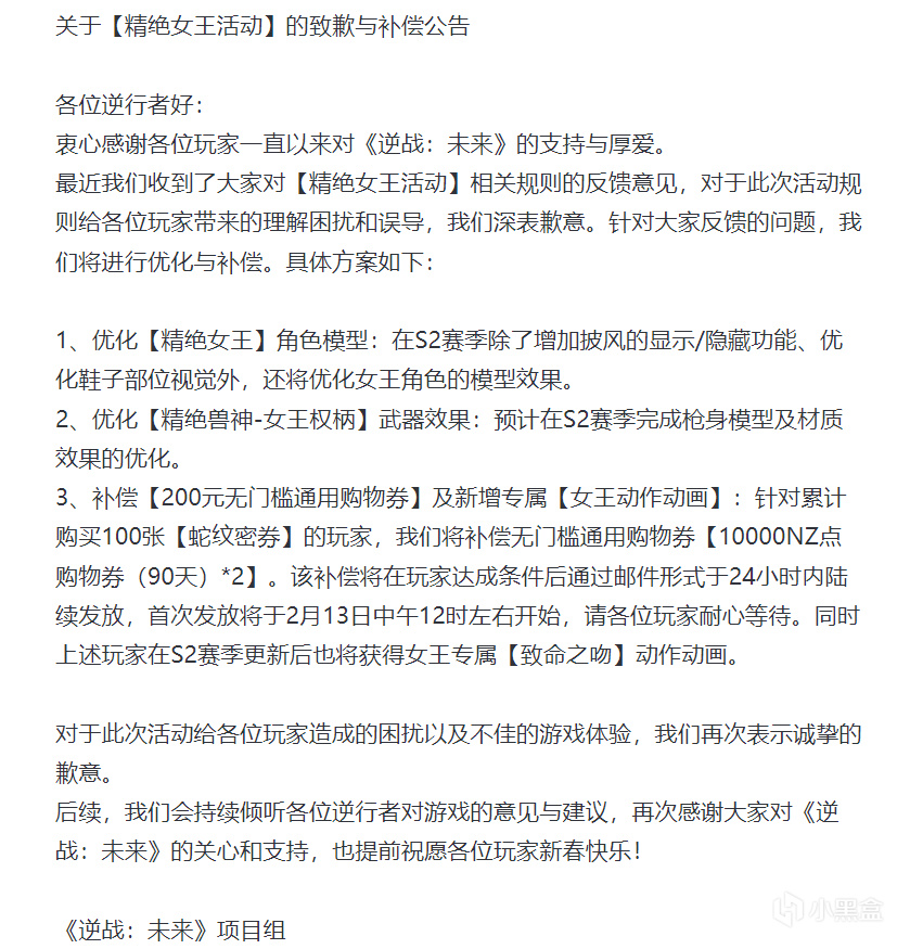 累计购买100张【蛇纹密券】的玩家,将获得无门槛通用购物券【10000NZ点购物券(90天)×2】作为补偿,奖励将通过邮件于达成条件后24小时内陆续发放,首批发放时间为2月13日中午12时。此外,在S2赛季更新后,还可获得女王专属动作动画【致命之吻】。