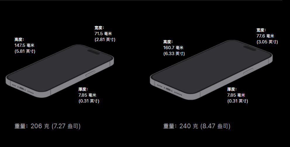 这意味着虽然 iPhone 15 Pro Max(不包括摄像头阵列)表面上会比 iPhone 14 Pro Max 厚 0.4 毫米,但整个设备(包括摄像头)将薄 0.19 毫米。IT之家附上 iPhone 15 Pro Max 尺寸:159.86 mm × 76.73 mm × 8.25 mm,包括摄像头总厚度为 11. 84mm。