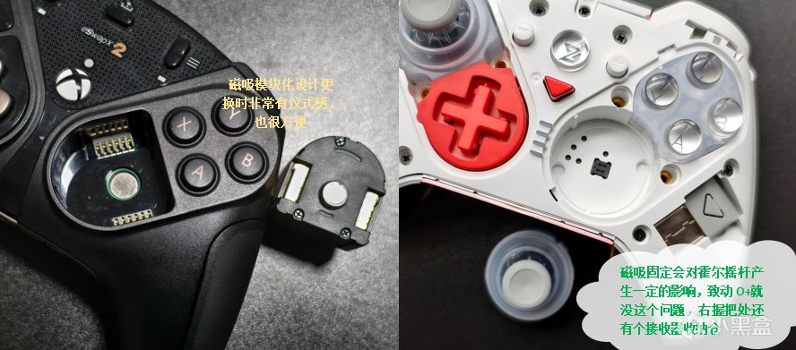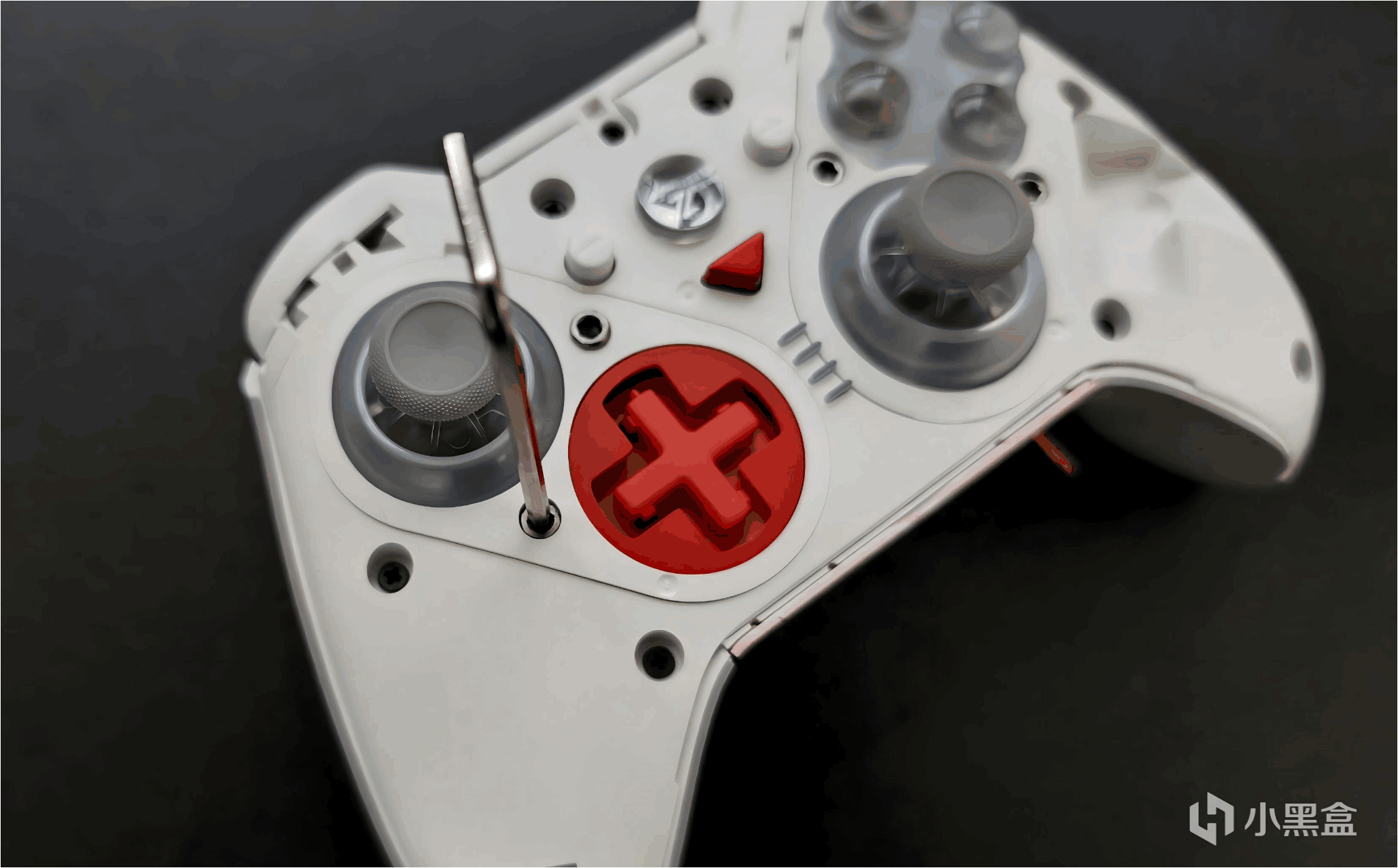 其它可更换的部件就不多介绍了,主要来看一下摇杆和按键模块是怎么更换的:首先是用附赠的内六角螺丝刀把固定外框的螺丝取下,然后就能轻松把模块取下来了,需要注意的是因为右摇杆和十字键是一个PCB板、动作键和右摇杆形状不同,所以不像前面评测的模块化手柄一样可以直接改变按键布局,而需要额外购买替换用的模块,这点就不如磁吸通用设计方便。