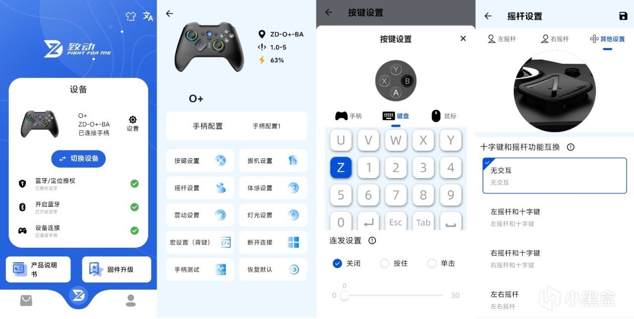 手机上的致动APP功能我看了下还是很全面的,像按键映射键鼠、扳机触发行程和摇杆死区调节、十字键和摇杆功能互换、扳机和握把四个马达震动强大单独调整及包括蓝牙模式下的原生三种扳机震动等等,只是我刚问客服也没说什么时候更新PC端软件适配。
