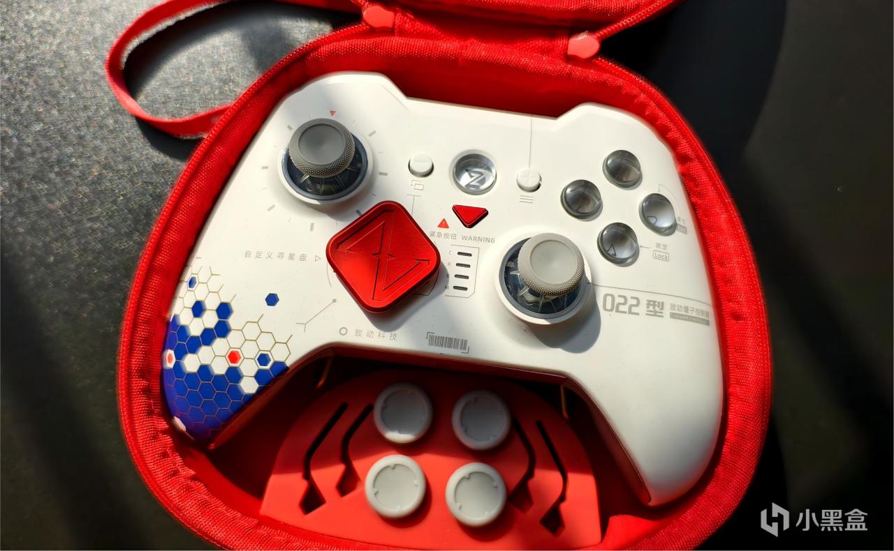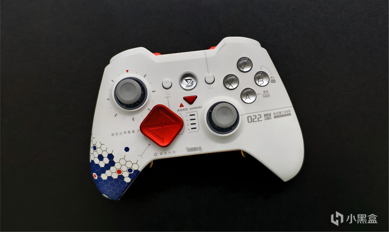 外观细节上,致动O+卓越仰望版的外观非常有辨识度,主体采用哑光白作为基底,搭配醒目的红色与蓝色作为点缀,面壳上还印有“致动科技”、“022型”等标识,加上透明的动作键和Home键,完美的将未来感与工业美学相融合。除了动作键和Home键外,透明的摇杆底座也都配备有RGB光效,加上透明的扳机和颇具特色的红色底盖,外观方面真的没什么可挑剔的。