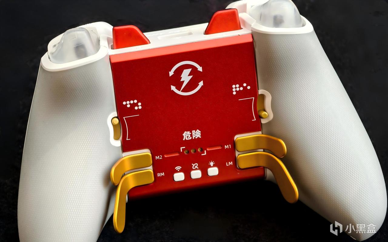 红色的底盖也很有设计感,除了切换扳机模式的金色拨杆外,还有磁吸充电接口和两组支持32步映射的金属磁吸设计的拨片背键。至于最下面的按键则分别是配对键、体感映射开关和灯光开关,虽然有3.5mm耳机孔但没有静音键和模式切换拨杆。另外,这个底盖应该也是可以更换的,可以连底盖一起换成带蜘蛛背键的黑色或白色底盖。