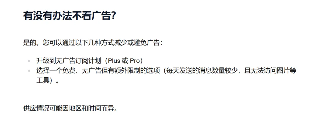 對於免費用戶來說,OpenAI 甚至提供了一個“無廣告模式”,但代價是你的使用限額會被進一步下調,同時限制訪問一些功能(如圖片、深度研究等是不可用的)。