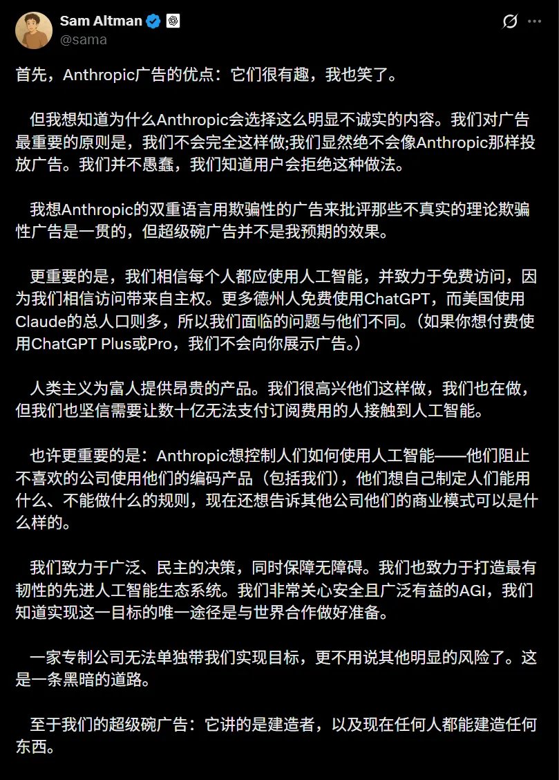 Sam Altman 這幾天在 X 上也是反覆多次強調,他一直在重申廣告不會干擾產品體驗,還抽空回應了競爭對手 Anthropic 的一些批評。