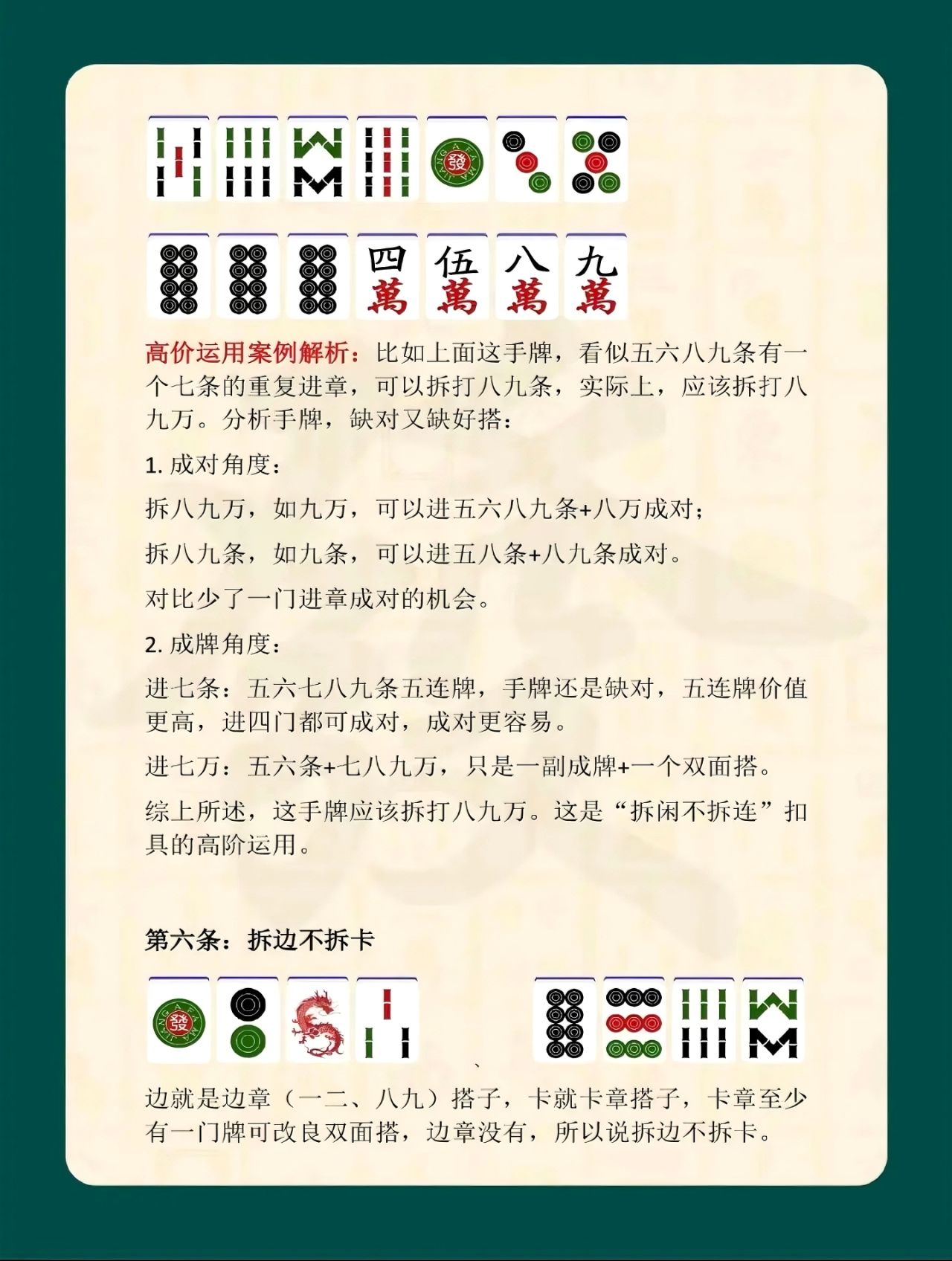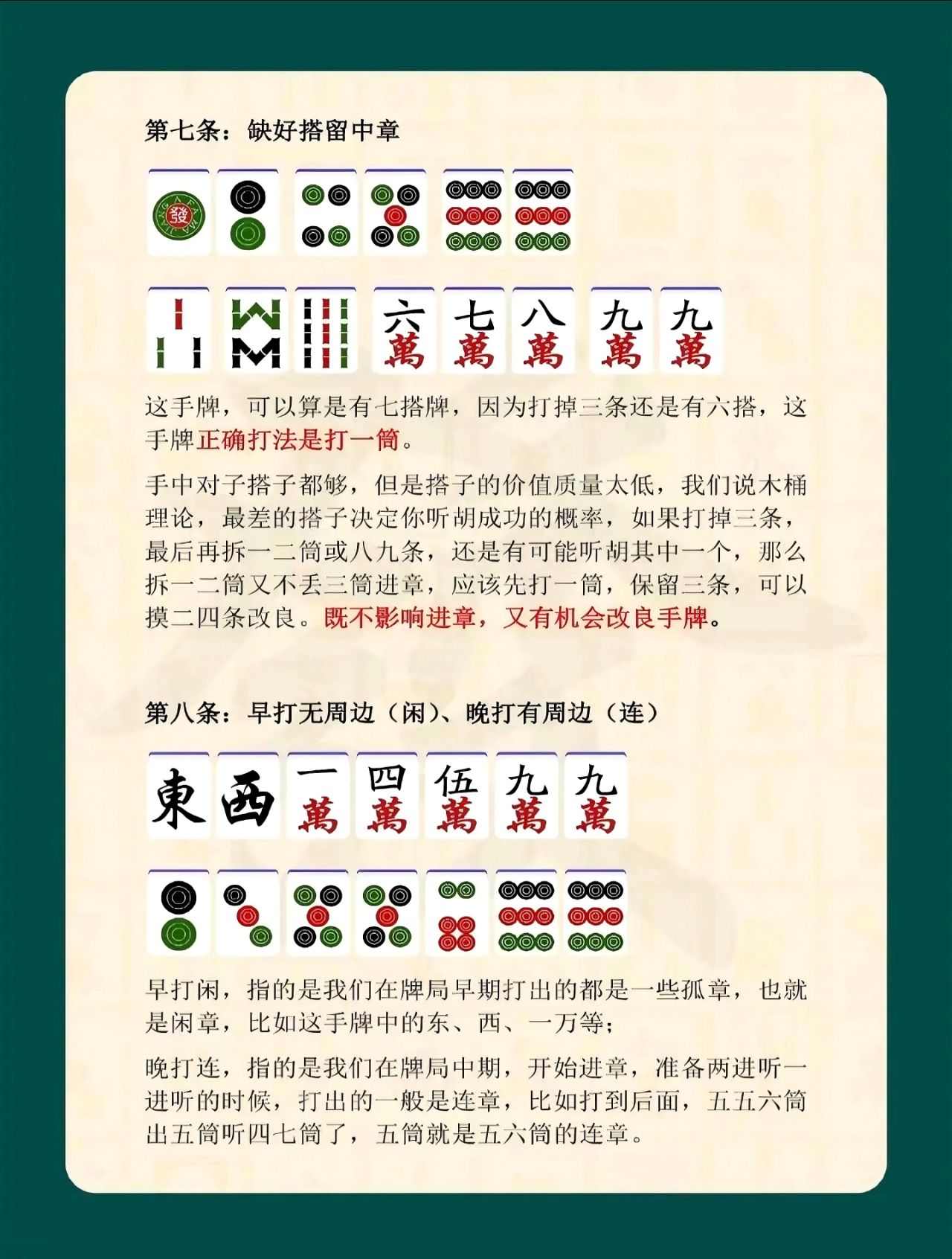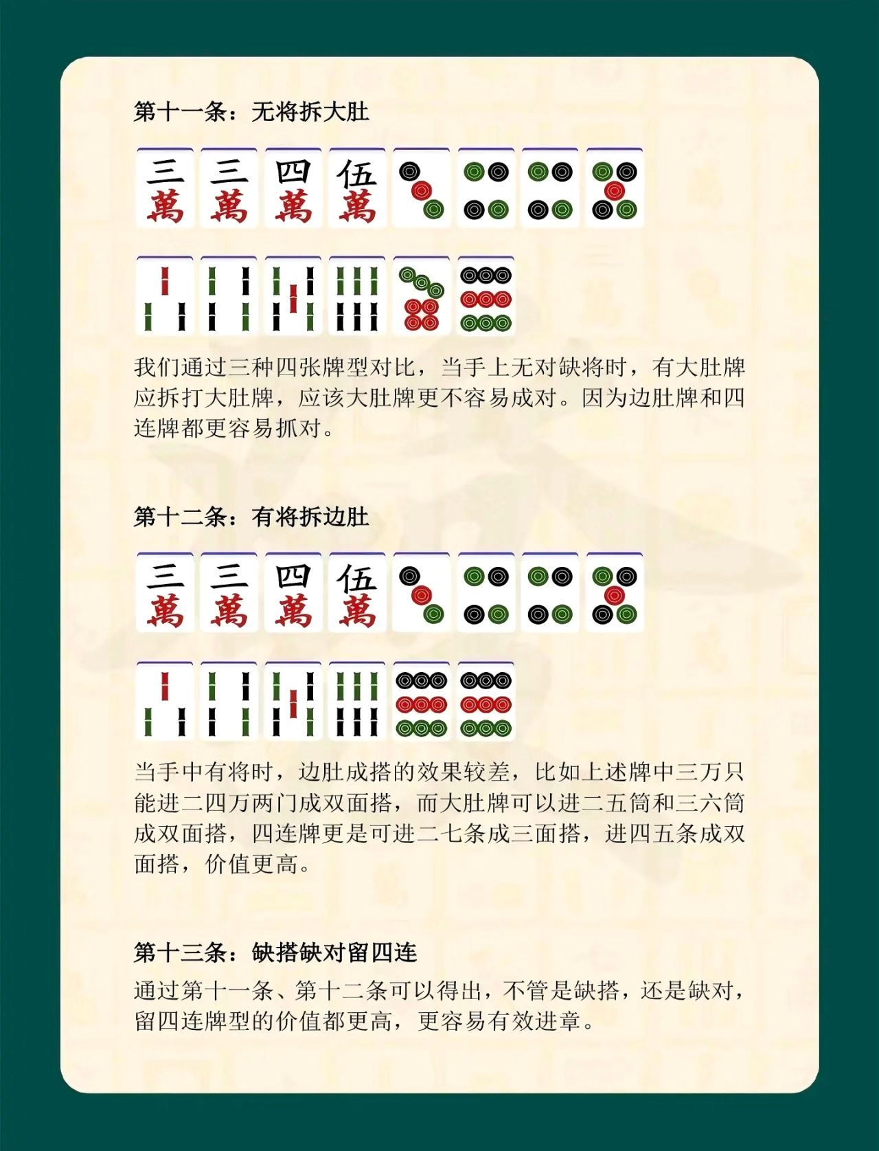 真正掌握口訣精髓,需要在對局中不斷實踐體會,將理論轉化爲自然的打牌習慣。做到思路清晰、取捨有度,既能穩步成型,又能隨機應變,纔算真正理解了麻將口訣的意義。