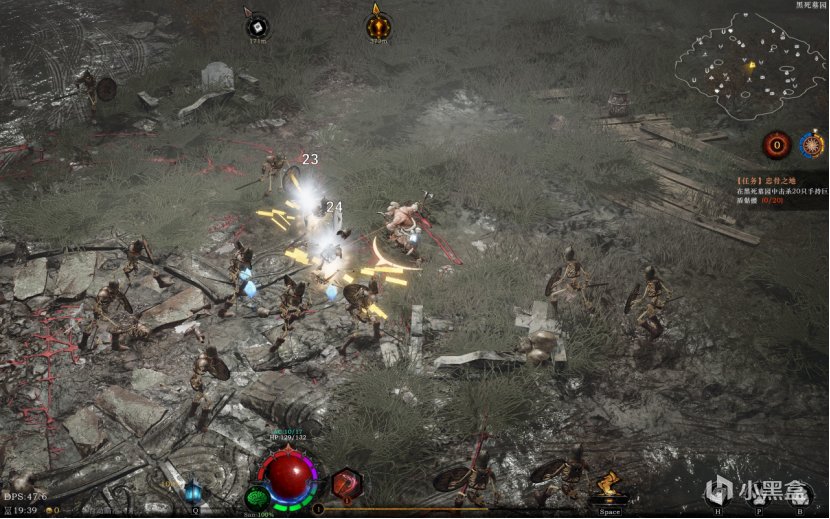不过开局没有新手引导,新手引导做得比较差,开局只能打一幅地图,那就是黑石墓园。通过打怪把获得的蓝色石头,用来升级。怪物的话 就是类似于割草,无限刷新的。Boss 战会用火焰围出一个区域,必须要击败 boss 才可以。且有任务可以做,通过观察小任务的图标 ,确定20分钟内的行走路线,哪里资源多就往哪边去。战斗还是比较困难的,小怪会源源不断地生成,有精英怪和远程射手来进行攻击。怪一多起来就特别难处理。而且在黑暗你必须要靠魂灯,不然就会掉 san。且黑暗视野不好,不好躲技能。