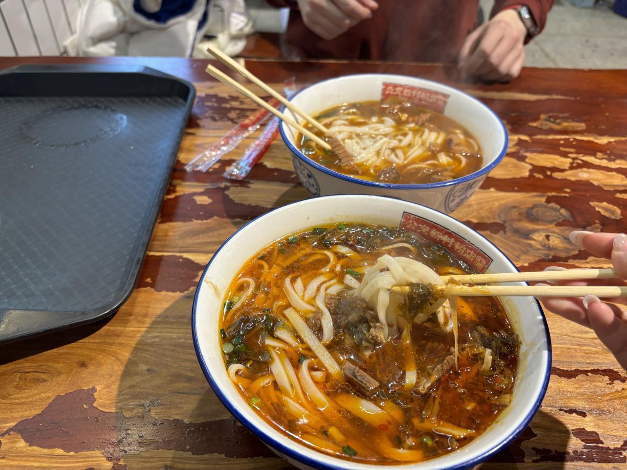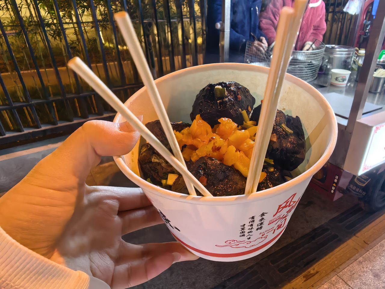 翌日清早寻粉馆。跟着导航钻进一家老店,店是寻常模样,门口两口大锅,一锅褐色的汤,一锅滚着红油。老板系着油渍麻花的围裙,眼皮不抬:“恰圆滴扁滴?”