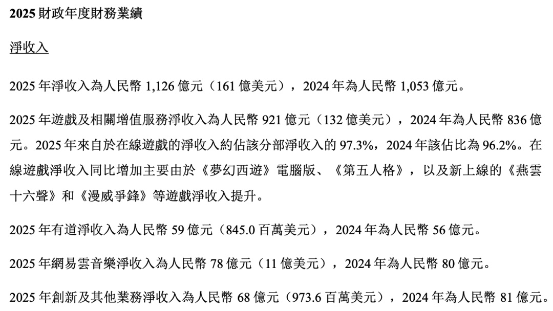 財報顯示,網易2025年Q4總營收275億元,遊戲及相關增值服務淨收入220億元。2025年全年,總營收達到1126億元。
