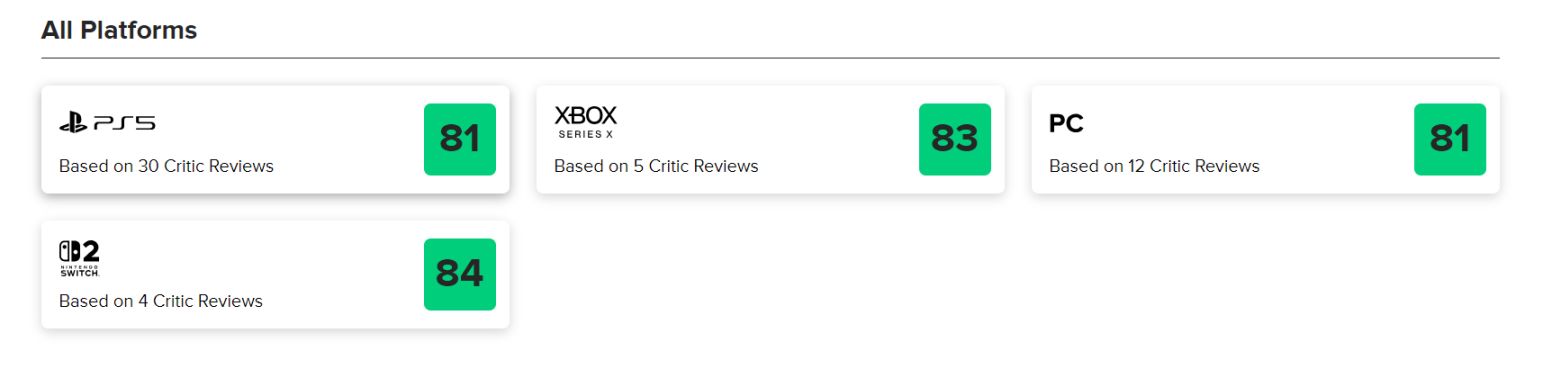 Metacritic(PS5端收录30家媒体评分,Metascore81分;Xbox端收录5家媒体评分,Metascore83分;Switch 2端收录4家媒体评分,Metascore84分;PC端收录12家媒体评分,Metascore81分)