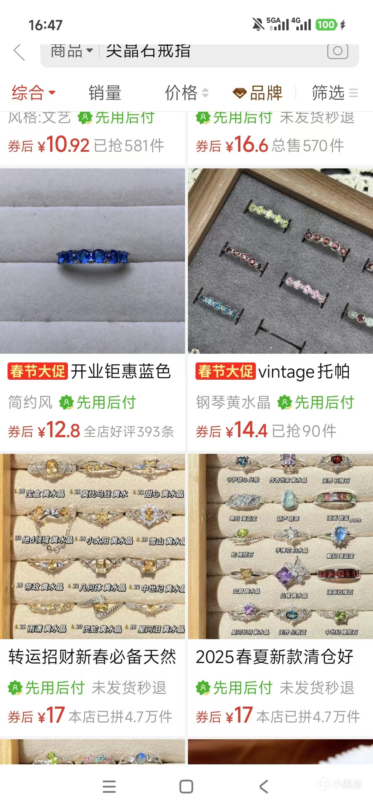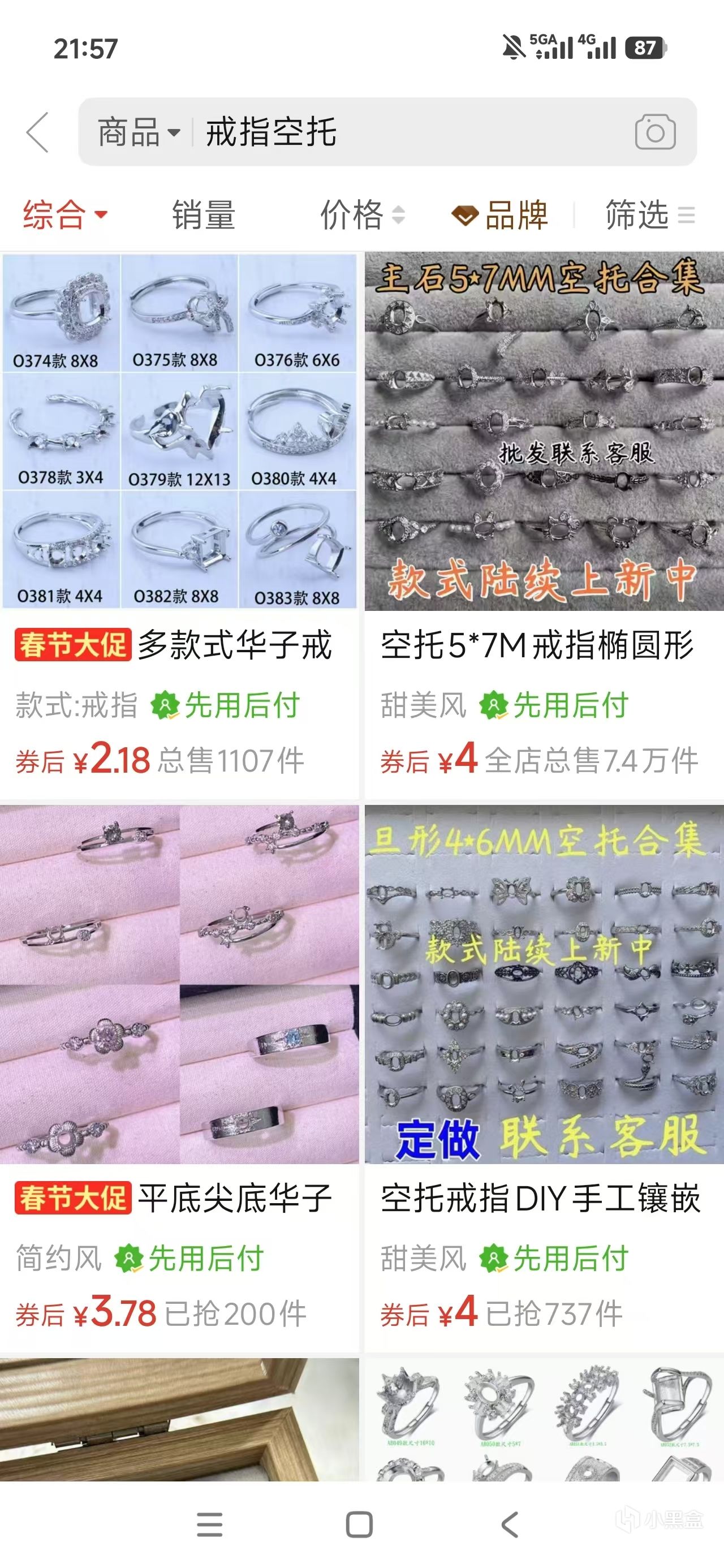 當然如果我們買的是一顆幾十塊一兩百的石頭,那肯定不能用貴金屬鑲嵌了,我們可以再次打開pdd,搜索戒指空託,大部分都是合金的,也有部分商鋪有銀託。