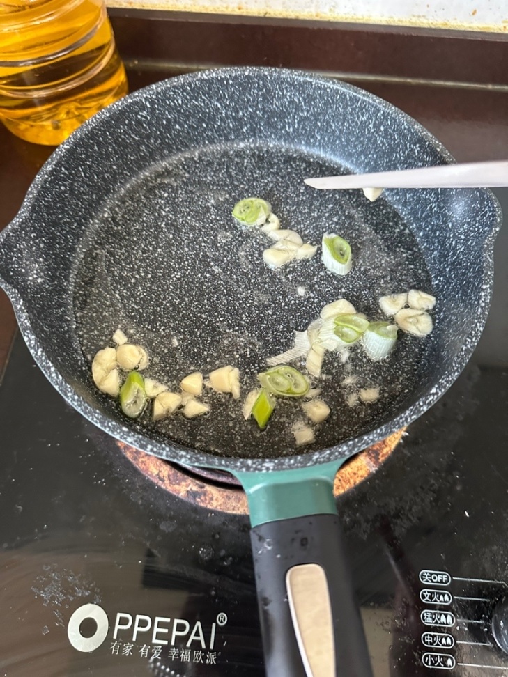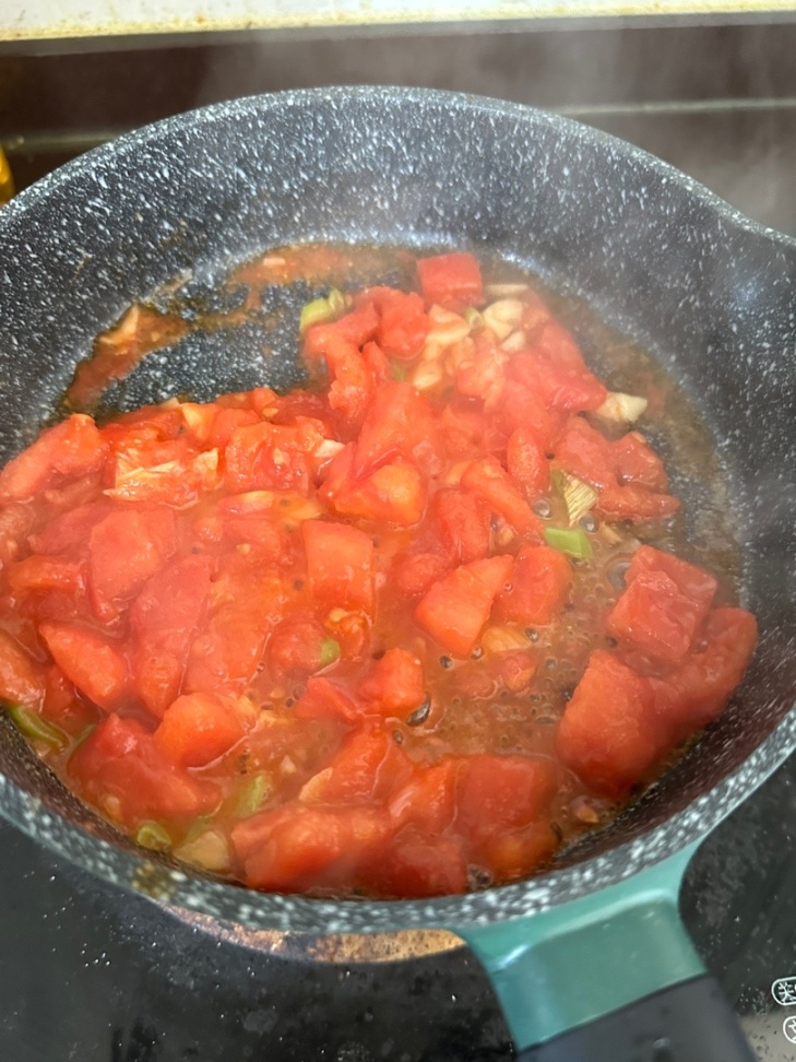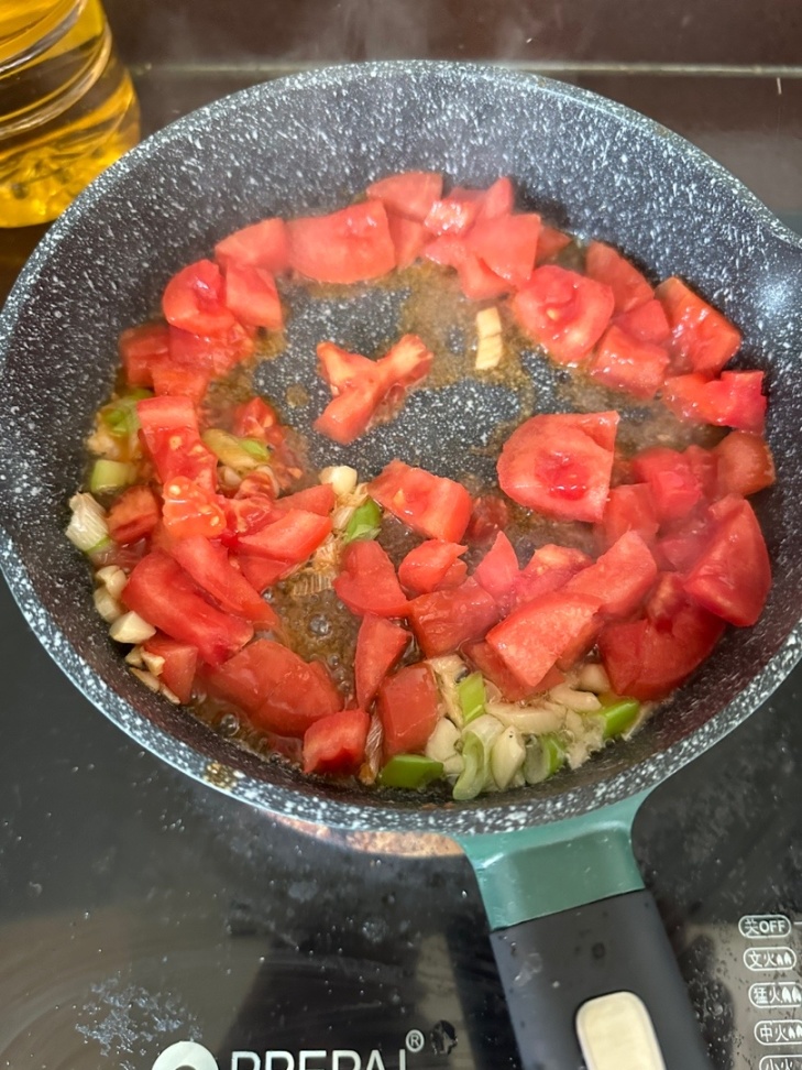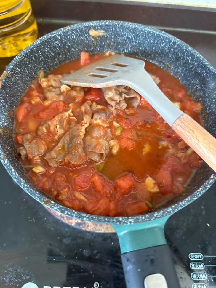 2.起锅烧油,葱蒜煸香倒入番茄丁炒出汁,然后加入肥牛,继续炒,加入少许蚝油,生抽,还有番茄酱,翻炒至番茄烂糊为止