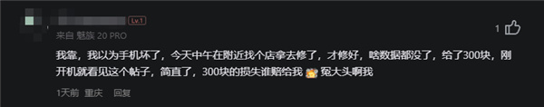 有用户称:“以为手机坏了,在附近找个店拿去修了,才修好,啥数据都没了,给了300块,刚开机就看见这个帖子,300块的损失谁赔给我。”