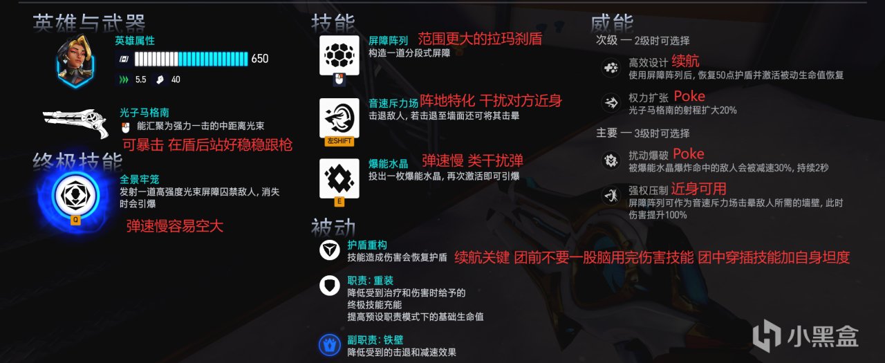 Shift击退40撞墙额外击晕40;E持续50 爆炸50-100,飞得较慢可以手动引爆;大招命中75,给对方套450盾+减速40%,根据剩余盾量爆炸100-300伤害