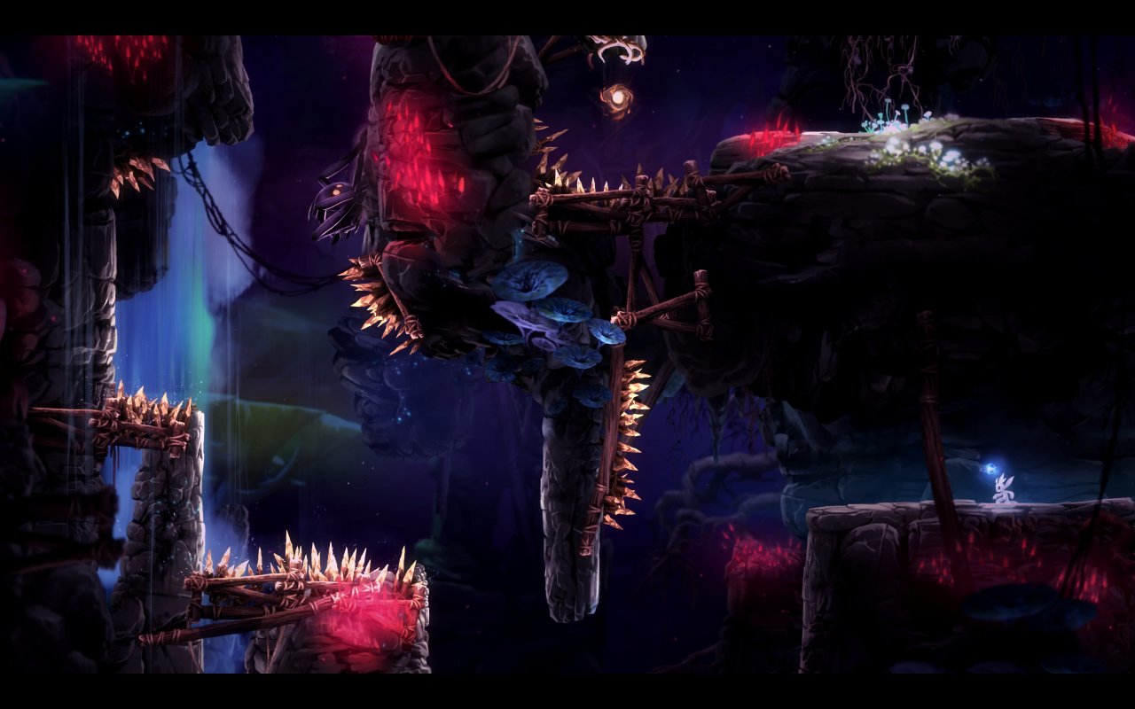 黑根洞穴則分爲兩個階段。前期以“能見度有限”爲核心。通過發光蘑菇和特殊平臺引導玩家的路徑,最終照亮整個地圖給予極強的視覺衝擊力。後期則通過揭示能力之間的巧妙配合,層層遞進的設計出了一系列驚豔的關卡。