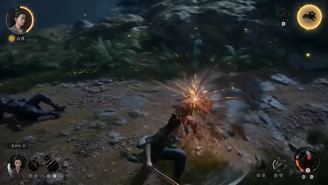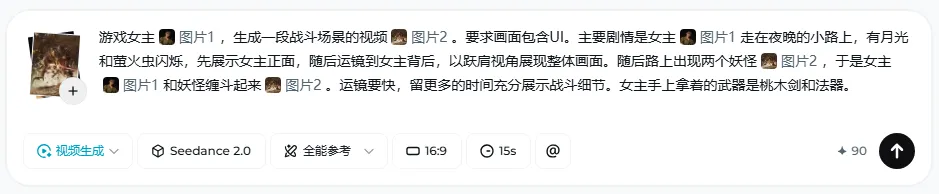 “游戏女主如图,生成一段战斗场景的视频。要求画面包含UI。主要剧情是女主走在夜晚的小路上,有月光和萤火虫闪烁,先展示女主正面,随后运镜到女主背后,以跃肩视角展现整体画面。随后路上出现两个妖怪,于是女主和妖怪缠斗起来。运镜要快,留更多的时间充分展示战斗细节。女主手上拿着的武器是桃木剑和法器。”