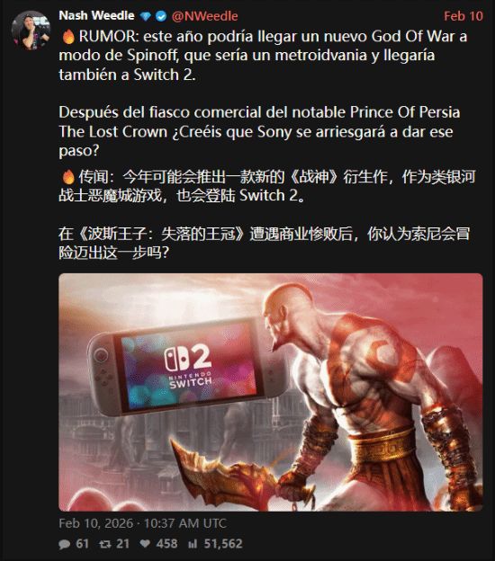 近日,知名爆料人Nash Weedle透露,《战神》系列将推出一款全新衍生作品,并登陆任天堂Switch 2平台。