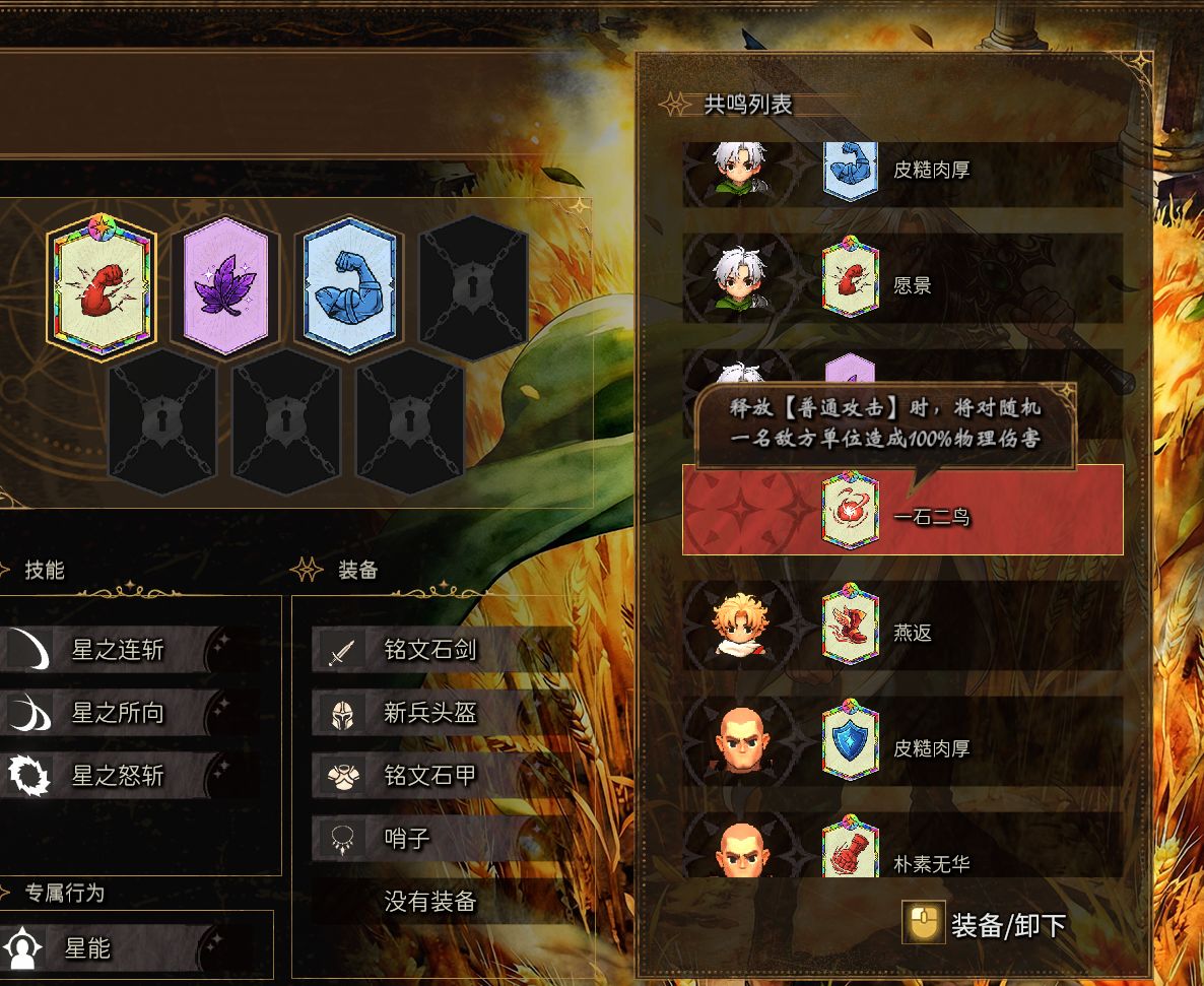 而旁邊的“共鳴列表”類似於天賦系統,你能爲特定角色自由添加不同的增益效果共鳴詞條。例如【皮糙肉厚】可以減免固定傷害;【一石二鳥】則在釋放普攻時,隨機對一名敵方造成額外100%的物理傷害,且不受角色限制。