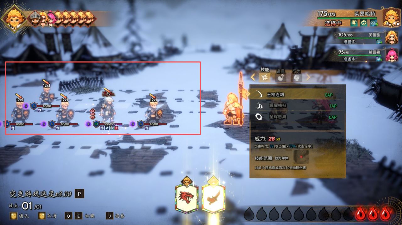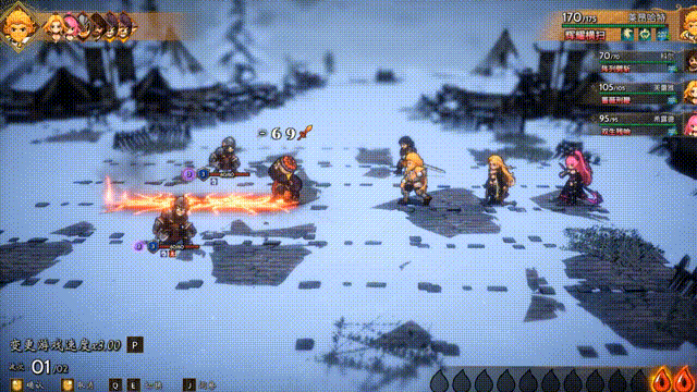 比如開頭的雪山戰鬥環節:中間站滿了一整排的敵人,而最深的一排陣型中僅站着一名敵人。按照順序,無疑是優先攻擊橫排且前置位的敵人。