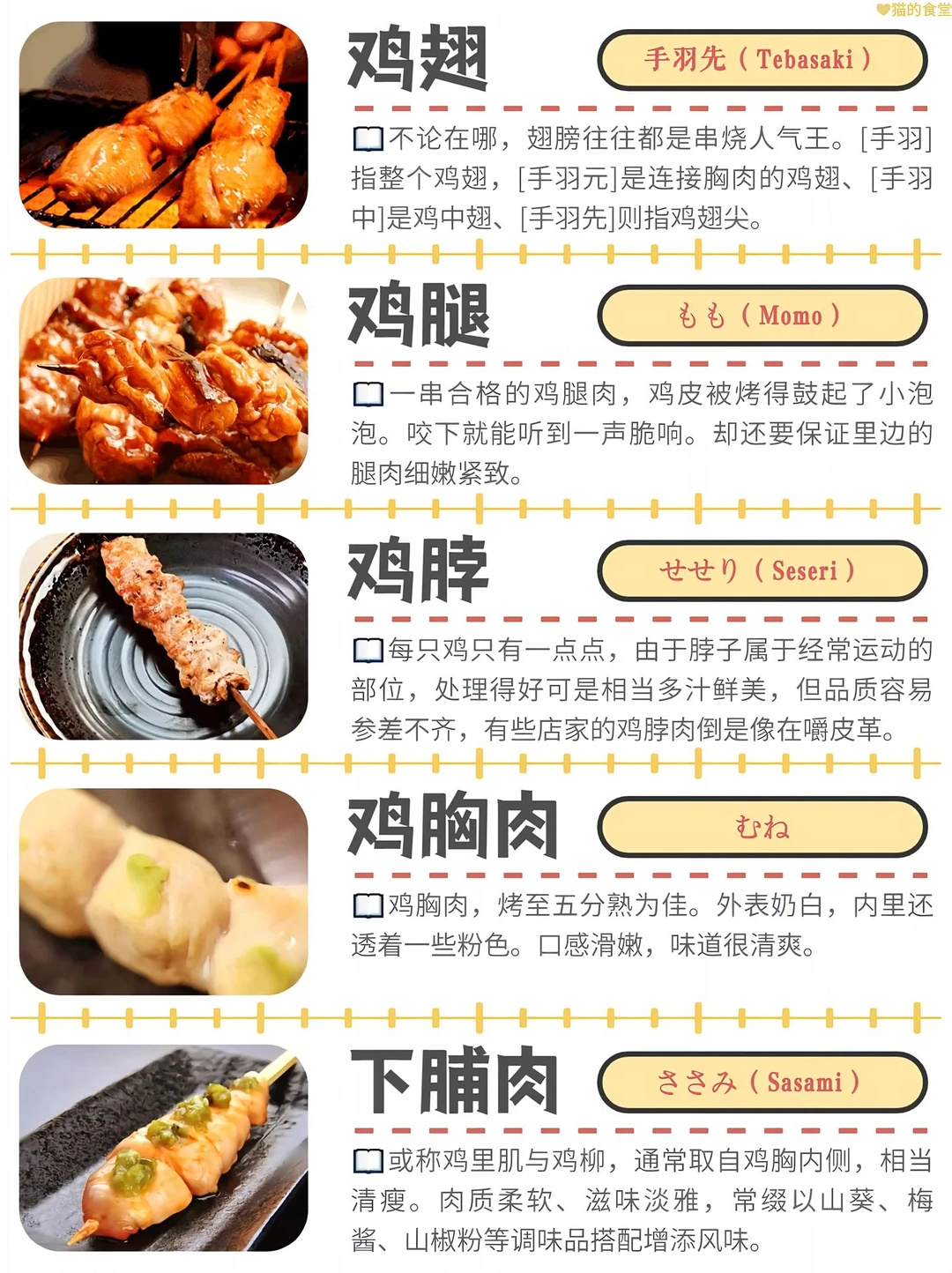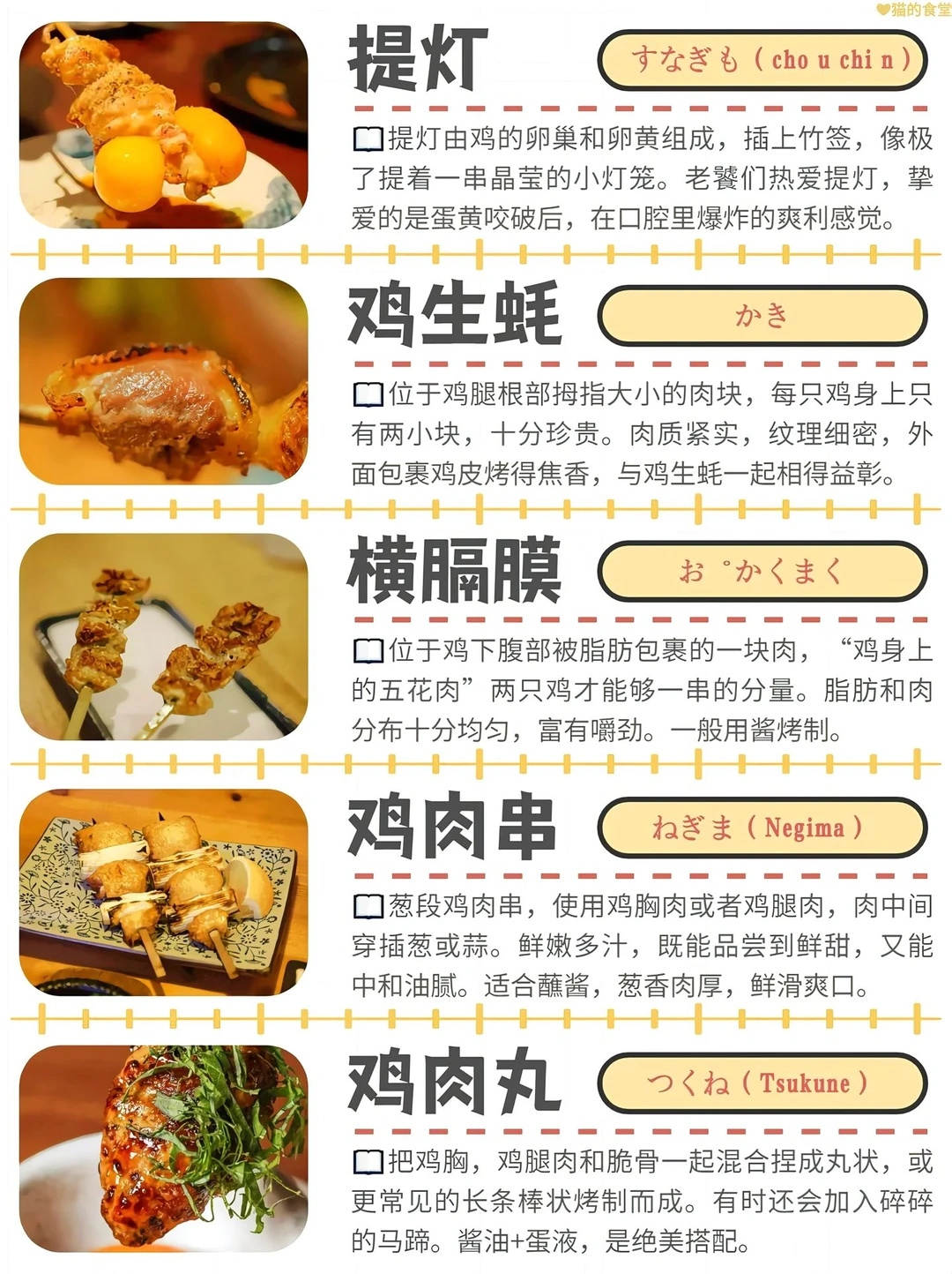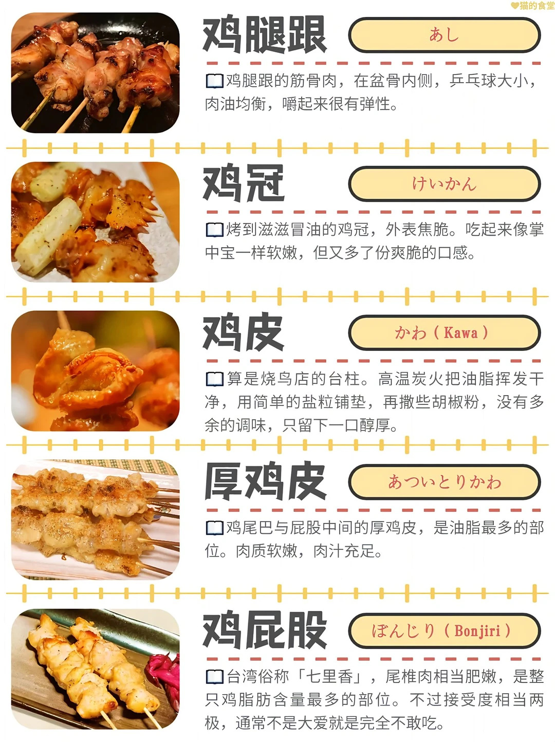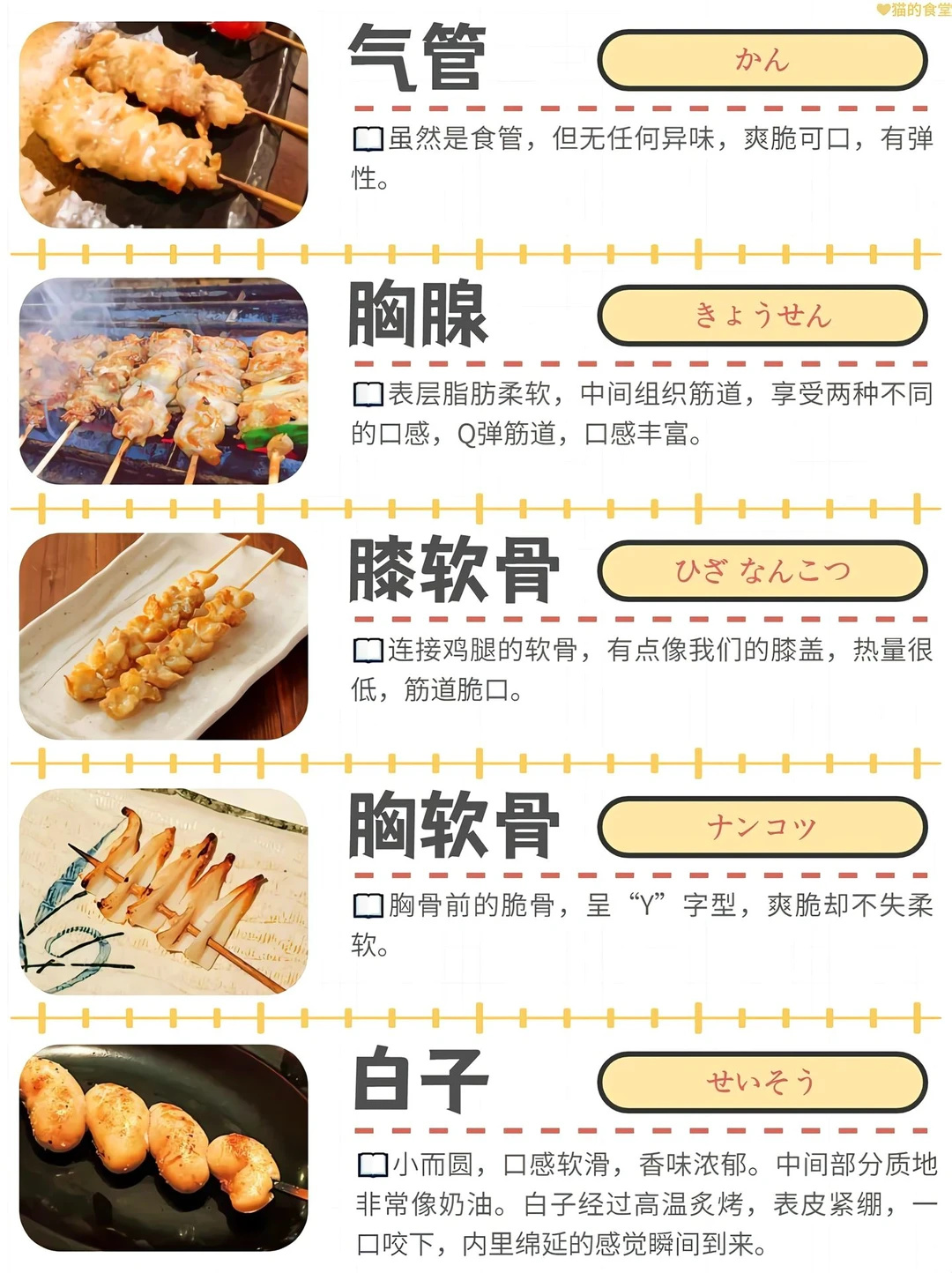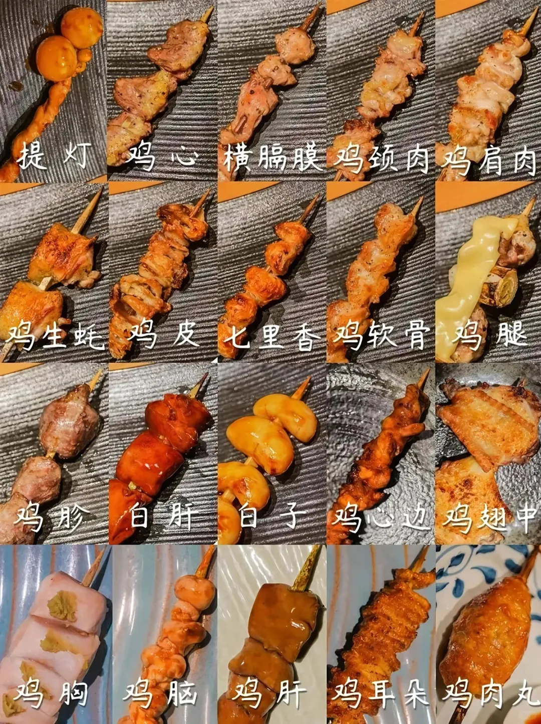 ✅ 热门部位 鸡翅(手羽先):人气王非它莫属!外皮烤得焦香,内里鲜嫩多汁。 鸡腿(もも):鸡皮烤到鼓起小泡泡,咬一口“嘎吱”脆响,腿肉细嫩紧致。 鸡胗(砂肝):炙烤后软嫩爽滑还能爆汁,淋上酱汁,谁能拒绝这美味!