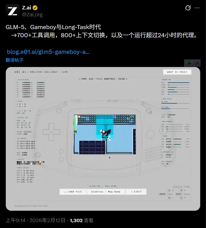 最让圈内人感到震撼的还是智谱放出的那个长任务演示,他们展示了 GLM-5 如何从零开始编写一个 Gameboy 模拟器。