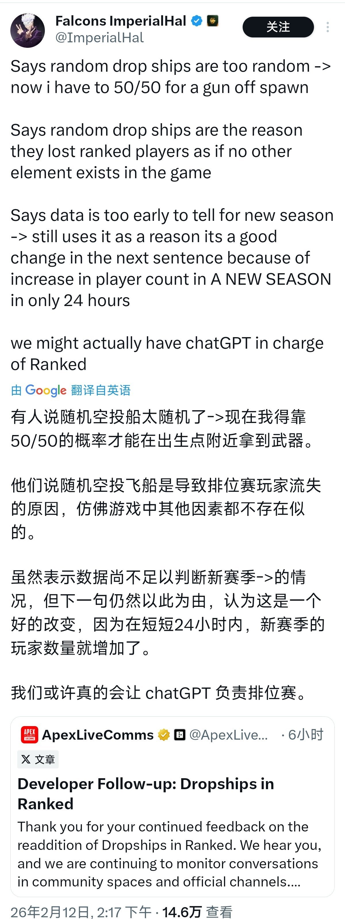 2026.2.12下午,APEX職業選手ImperialHal轉發AEPX推文,並配文DISS重生的前言不搭後語。