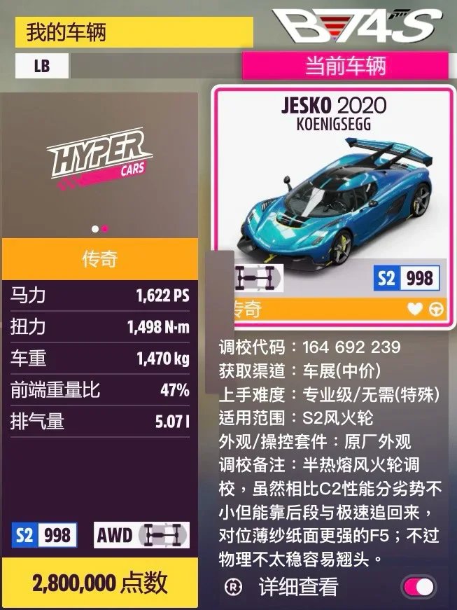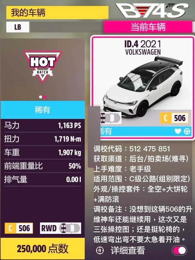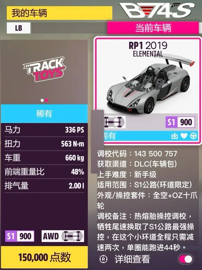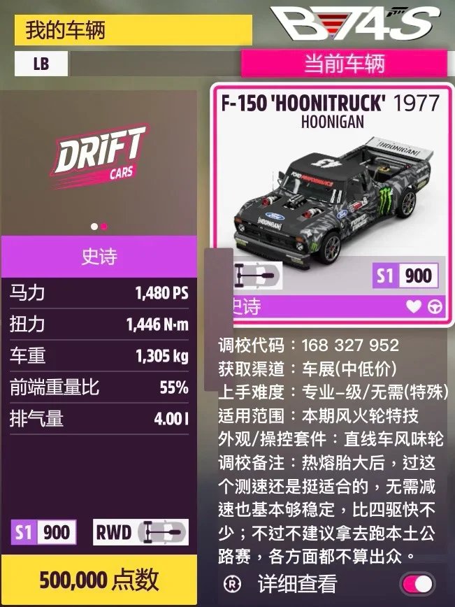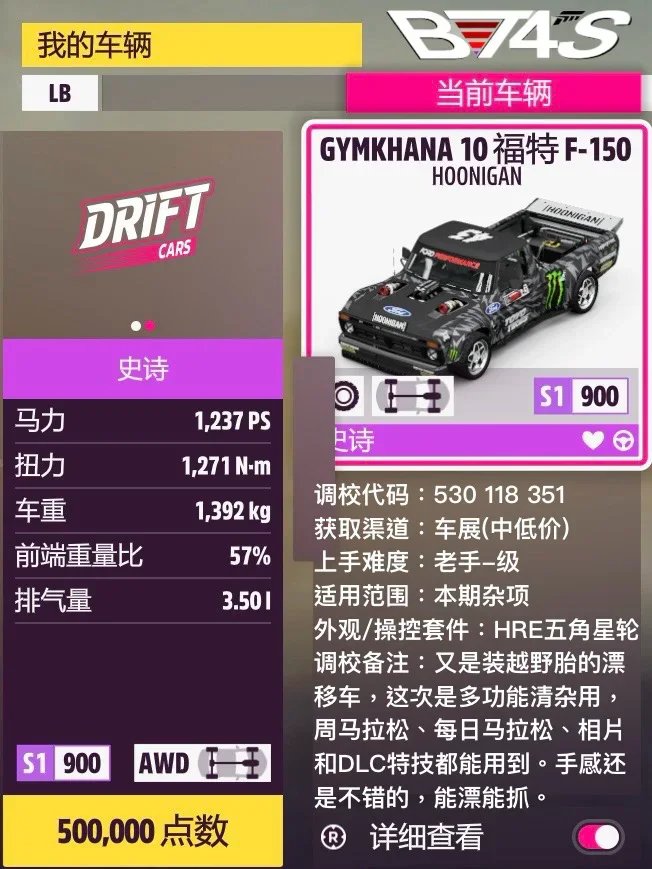 忘了这车开局送不送了,应该是不送,那没抽到的只能花50w在车展买了。或者在本期马拉松商店换也行,但是怎么算都不值,除非点数溢出不然还是优先用cr吧。搞了个兼顾dlc特技的多功能调校,底子是漂移车所以还算能漂,越野胎抓地也不算烂,清清杂没什么问题。Hoonigan家除了RS200外基本就都是玩具特技车了,不过其实这个主题还是挺有意思的,虽然个人对改装车的了解不深。然后这次录了个本期能用到这车的内容的参考视频,链接杂项参考。