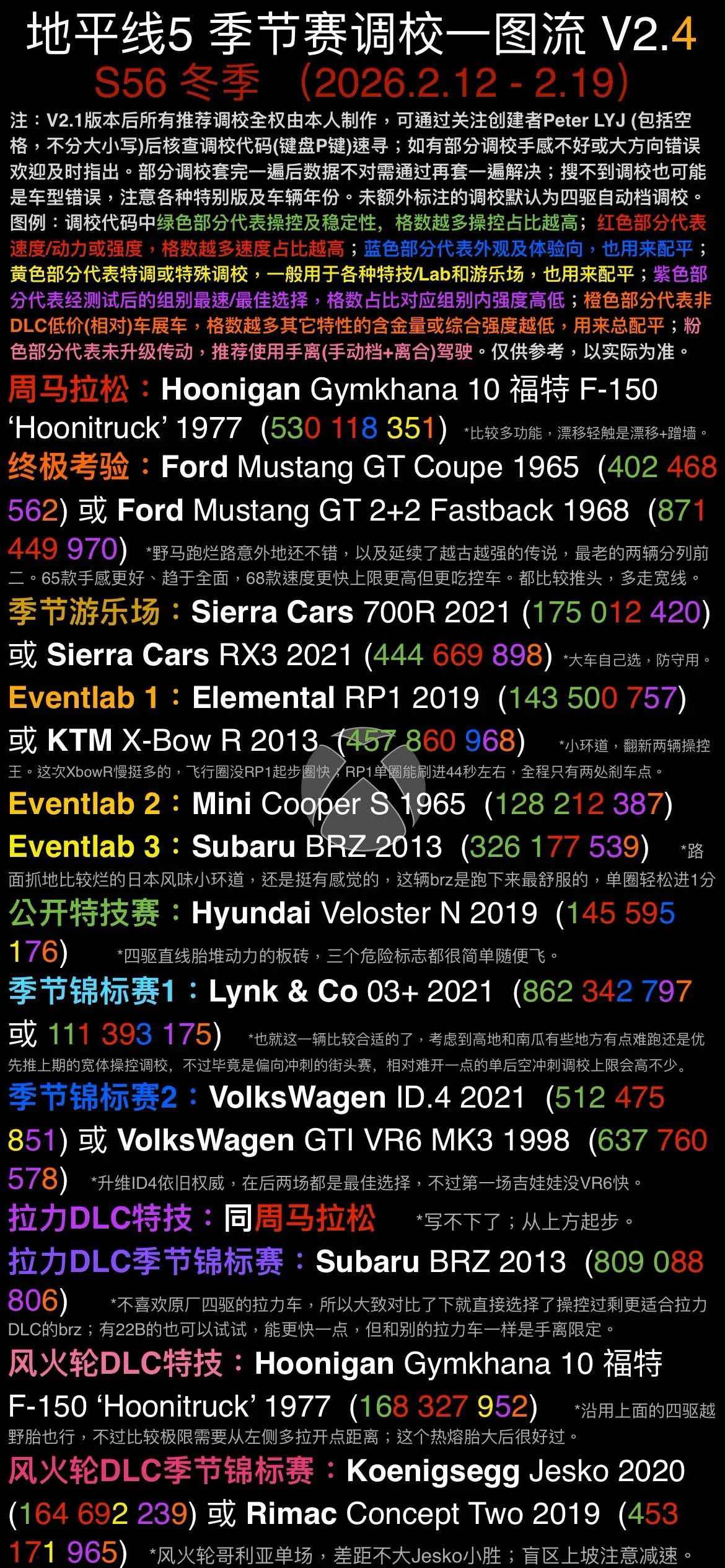 单是春节主题的话,没必要把标题的红色调得这么深… 这两个月一直没怎么休息好,身体机能也是直线下滑,常常没玩多久就不自觉地躺床上了。虽然之前想着趁超长假期“多玩玩享受一下”,但也不想留下永久的病根,所以现在决定从下一季开始“摆烂”不做完整攻略了。虽然也不一定是真摆烂了,还有不少别的想做的事,但没有了每周固定的压力会轻松非常多。后续还是会回归的,等休息好了、研究好了、准备好了,一个月或两个月也可能是随时。以及下季之后还是会尽力“找人代做”,也不要求像我一样做得这么细,“合资”把车选出来就行;当然我自己也不至于不玩季节赛了,所以可能会给出点私人选择,不过就不考虑稀有度什么的了。离6代开玩也就三个月了,现在开摆应该也影响不大吧。