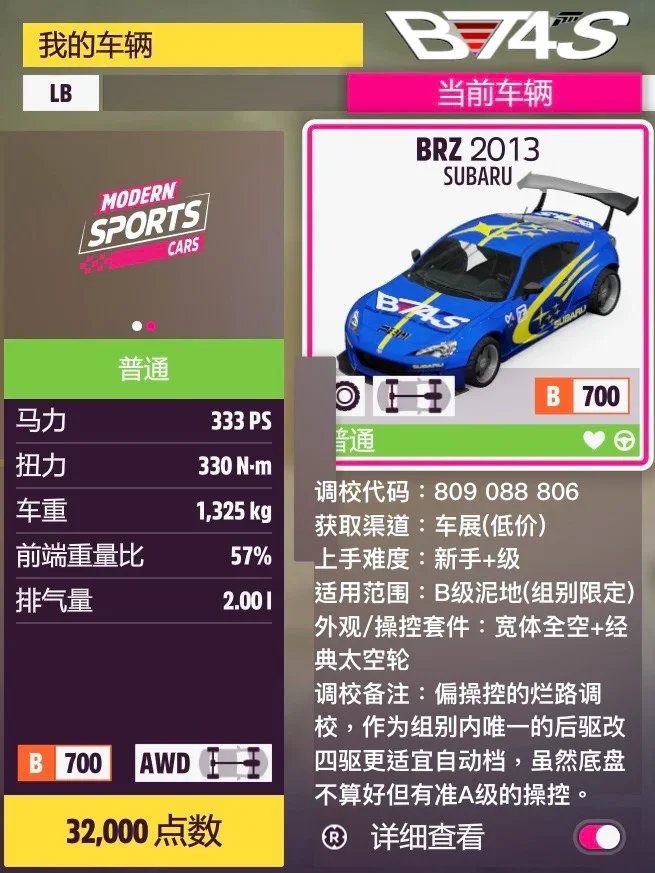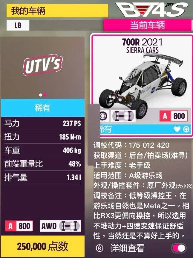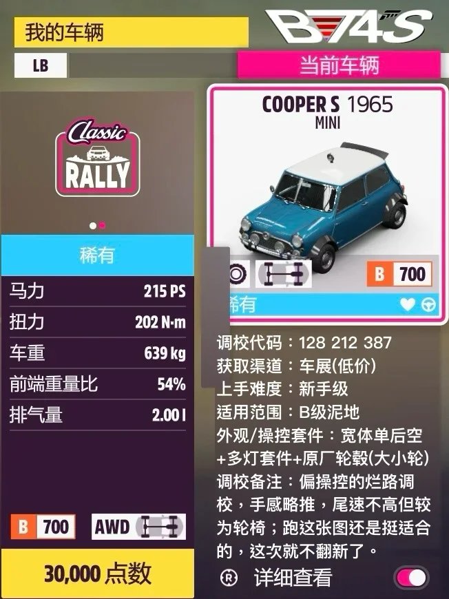 在一众原厂四驱的拉力车里藏着一辆后驱操控车,自然就把它拎出来了。A级的操控配上不算适合非铺装的底盘感觉还可以,至少跑拉力DLC不会缺操控;正常拉力车里面22B比较快,但和其他车一样都是手离限定。