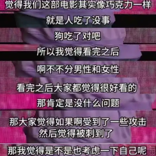 不仅如此,旁边的一位编剧还嘲讽似地补充:“我们的电影是巧克力,人吃了没事,狗吃了会死”“如果感觉受到了攻击,是不是考虑一下自己的问题呢”。
