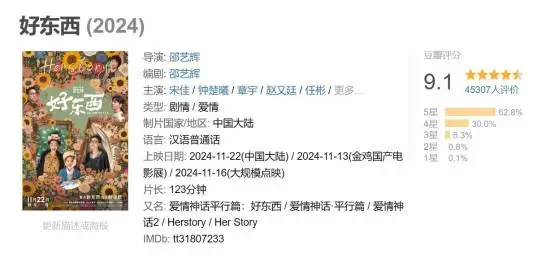 夸张到什么程度呢?某东西在豆瓣9.1的高分,比奥斯卡最佳影片《绿皮书》还高了0.2分,和经典的指环王第一部拿到了同样的分数。放眼豆瓣,简直是全球前10影片的水平。