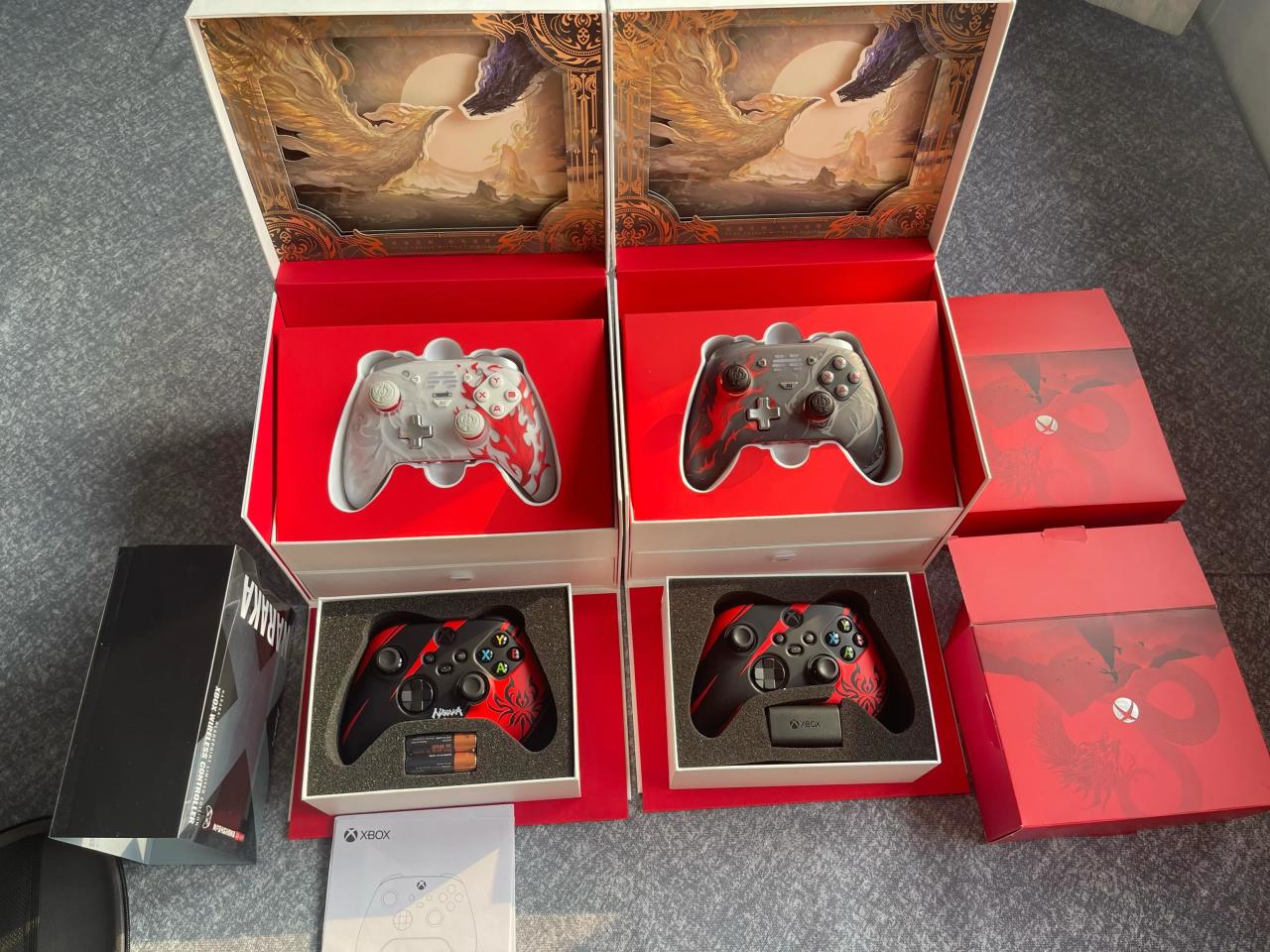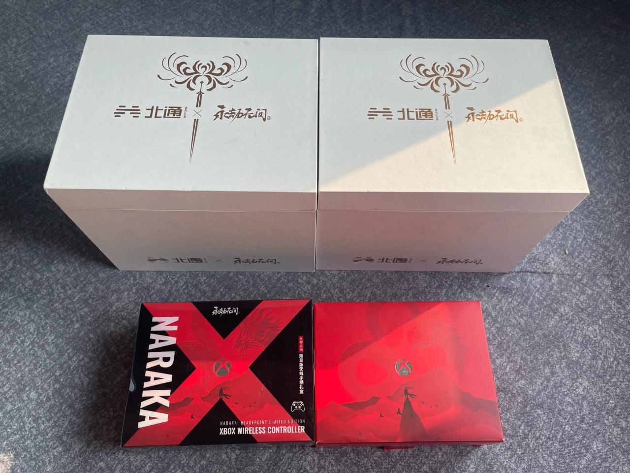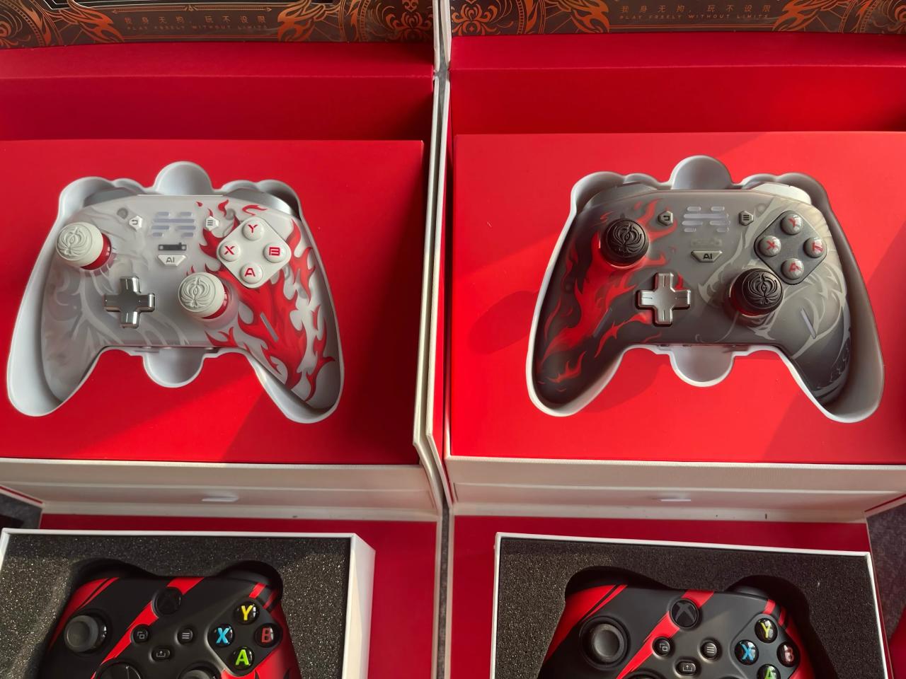 大家好,膨大猪又来分享自己的小小收藏了,只不过这一次依旧暂时摆脱垃圾佬的身份,来见识一下收藏猪吧,这次的手柄是所有和永劫无间联动的手柄,包括两把北通永劫无间限定礼盒和两把Xbox永劫无间联动抽奖礼盒。
