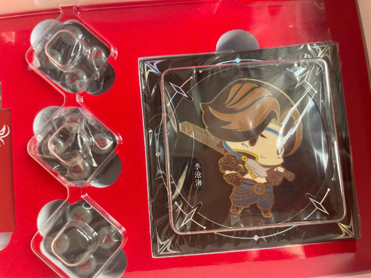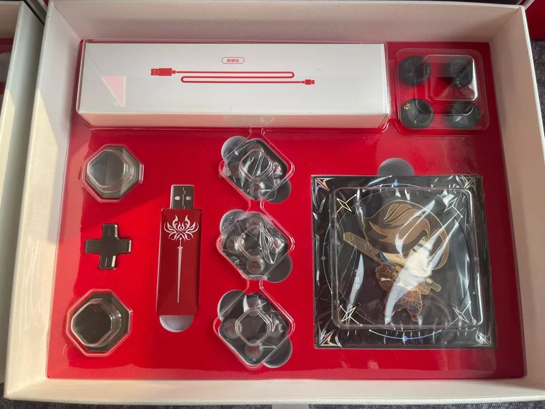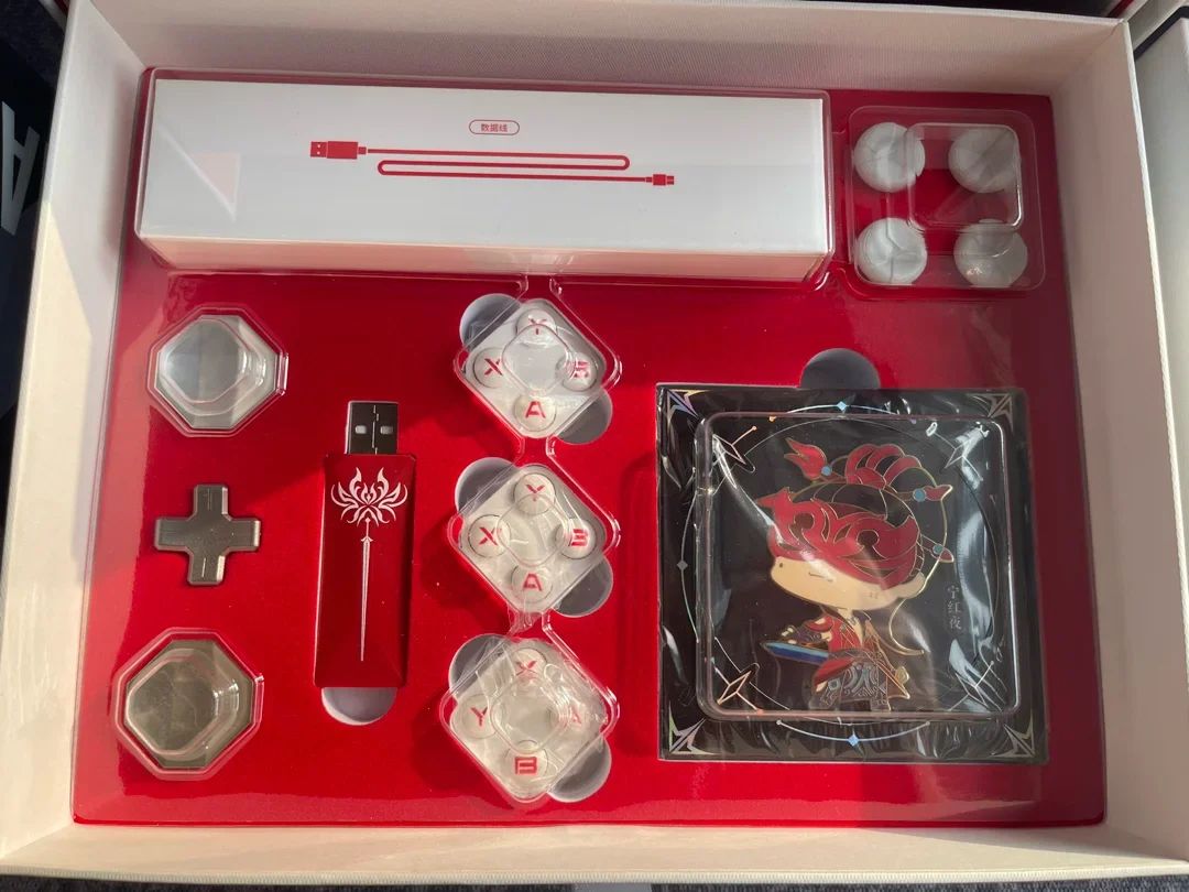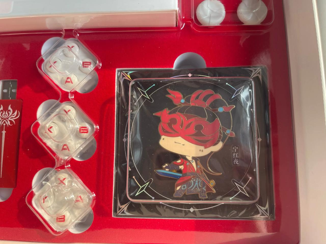 然后就是别的配件,包括接收器,替换的按键模块,十字键模块,摇杆和线啥的。还有一个徽章挺好玩的