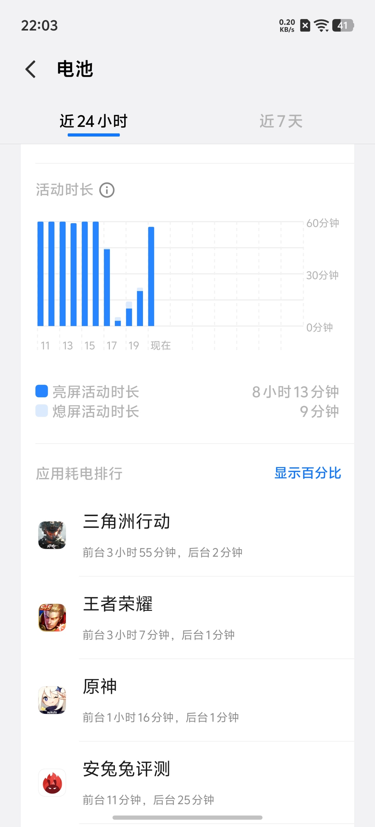 拿到手機後總共測試了3小時農+4小時粥+1小時O+安兔兔烤機,累計時長8小時的情況下總耗電不到60%!